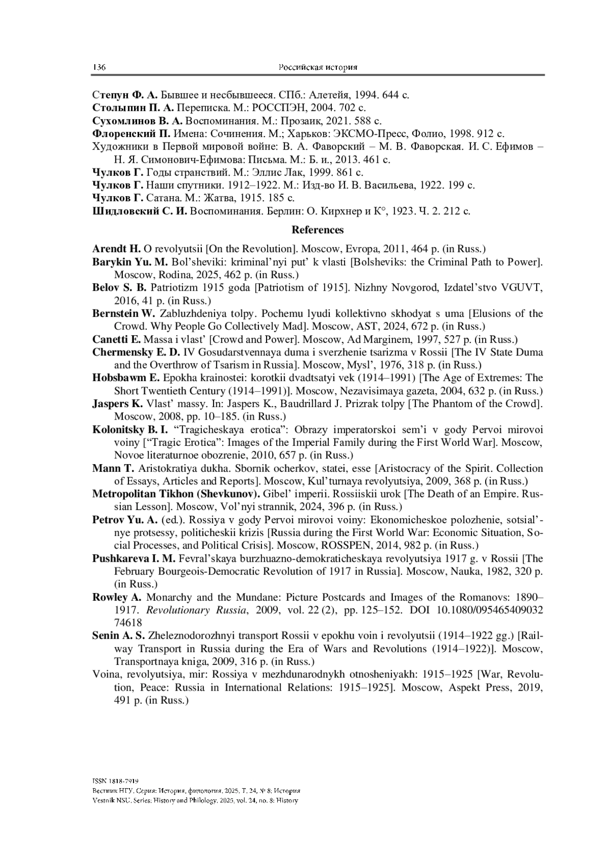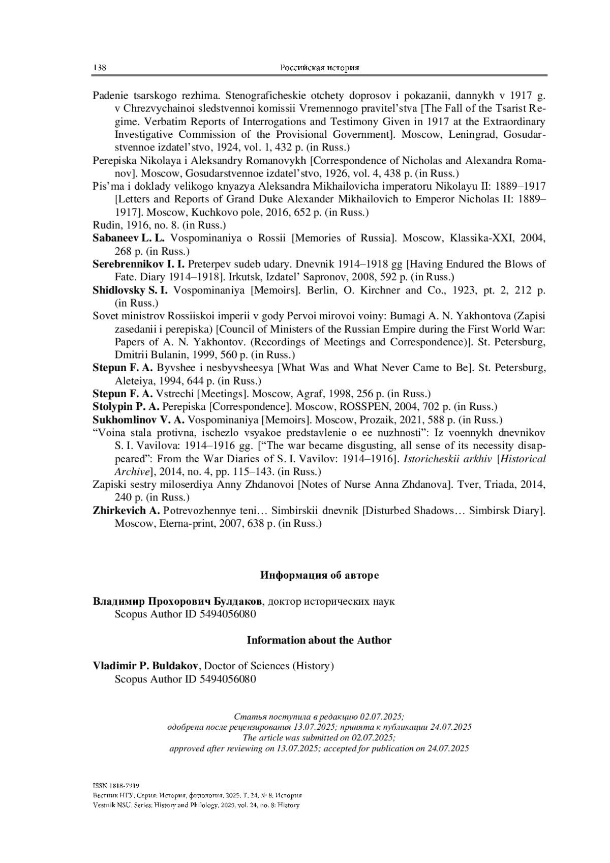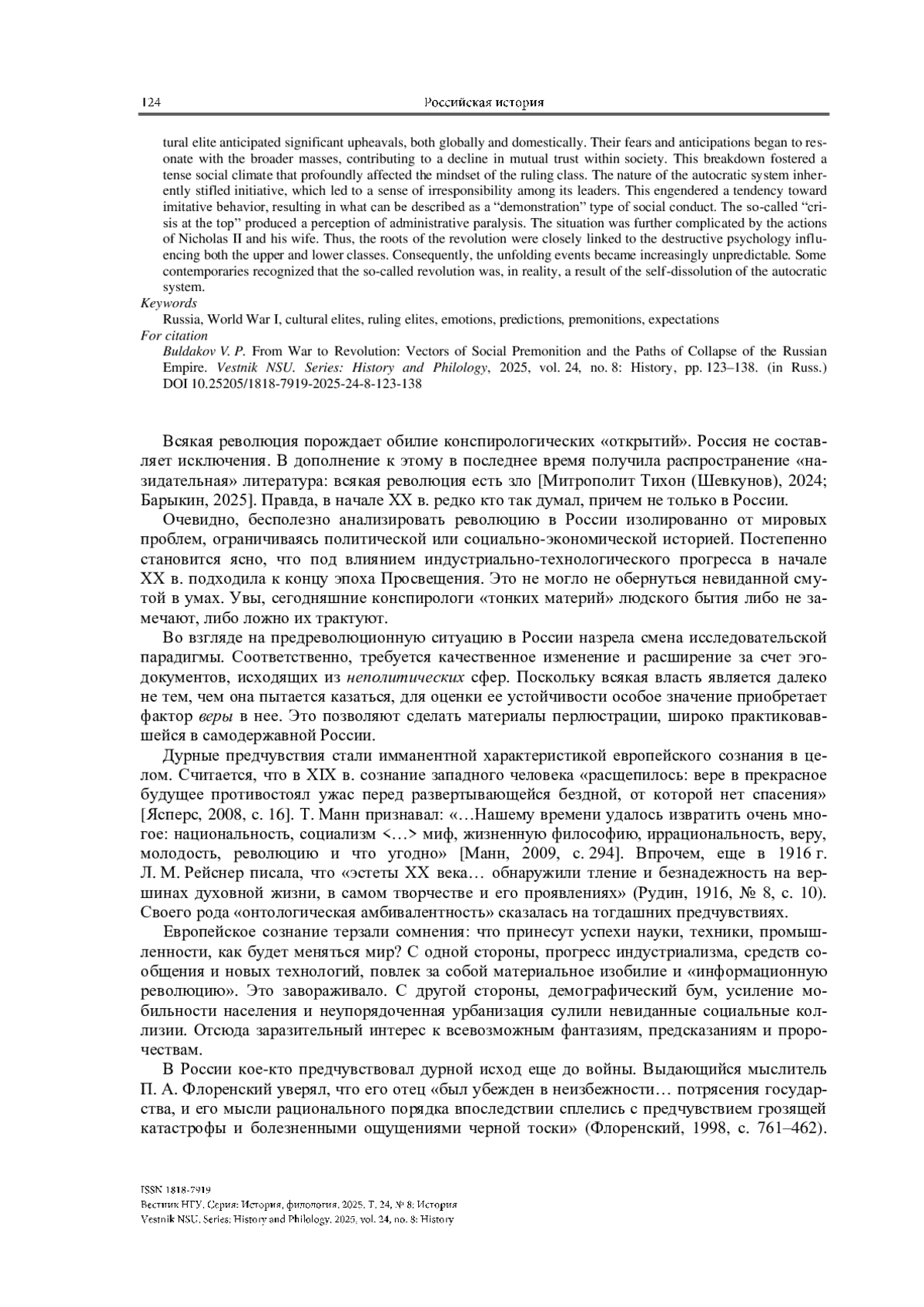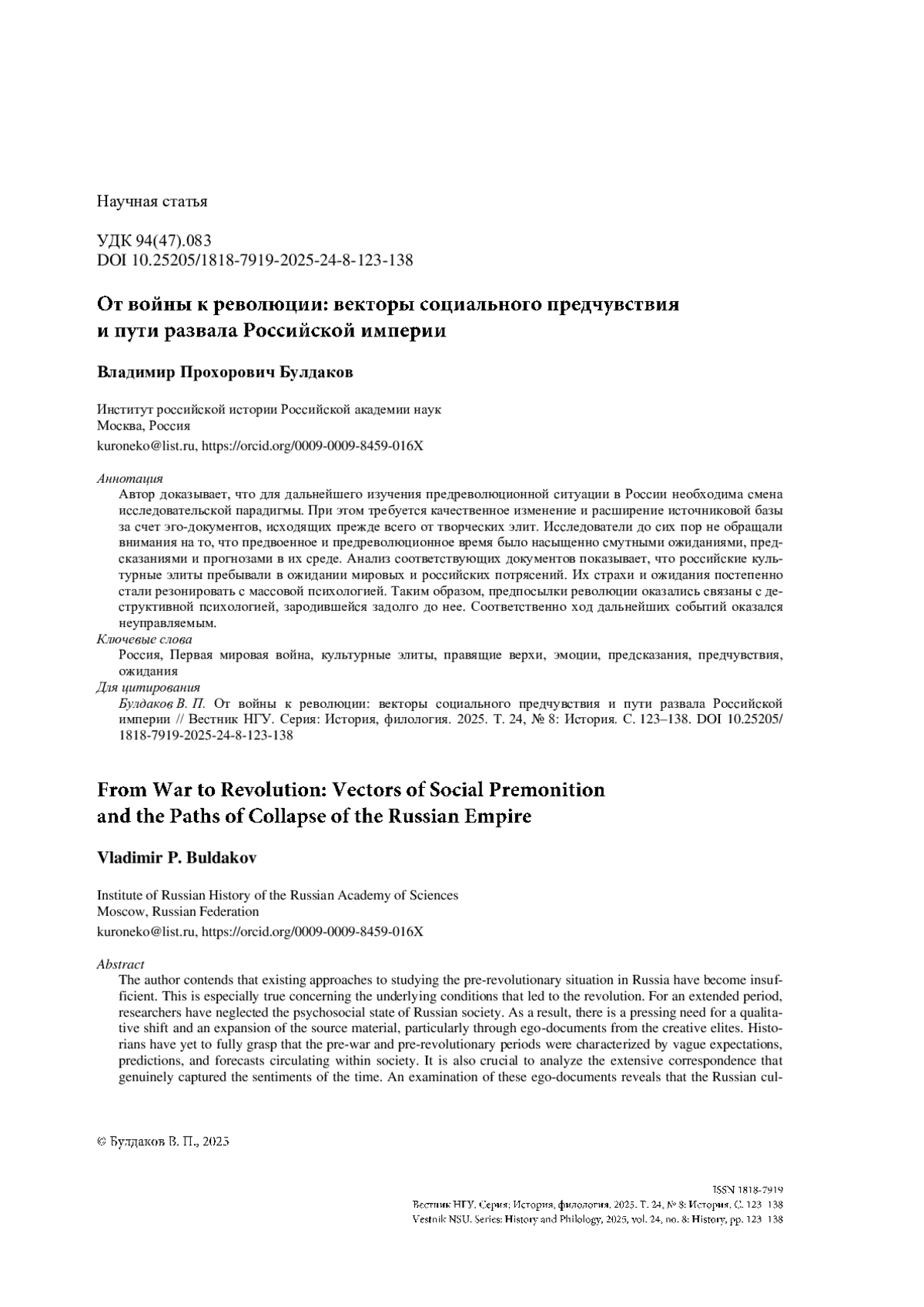 БУЛДАКОВ В. П. ОТ ВОЙНЫ К РЕВОЛЮЦИИ: ВЕКТОРЫ СОЦИАЛЬНОГО ПРЕДЧУВСТВИЯ И ПУТИ РАЗВАЛА РОССИЙСКОЙ ИМПЕРИИ // ВЕСТНИК НГУ. СЕРИЯ: ИСТОРИЯ, ФИЛОЛОГИЯ. 2025. ТОМ 24, № 8