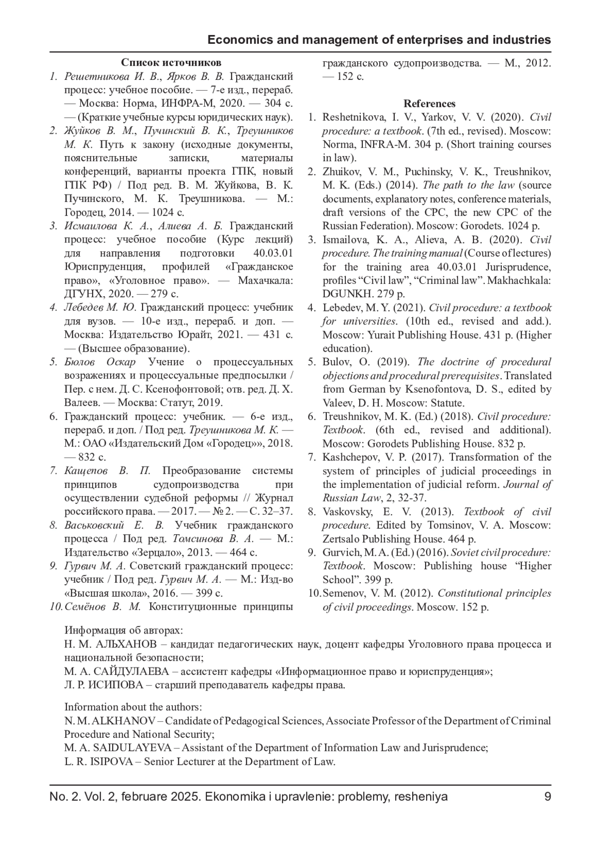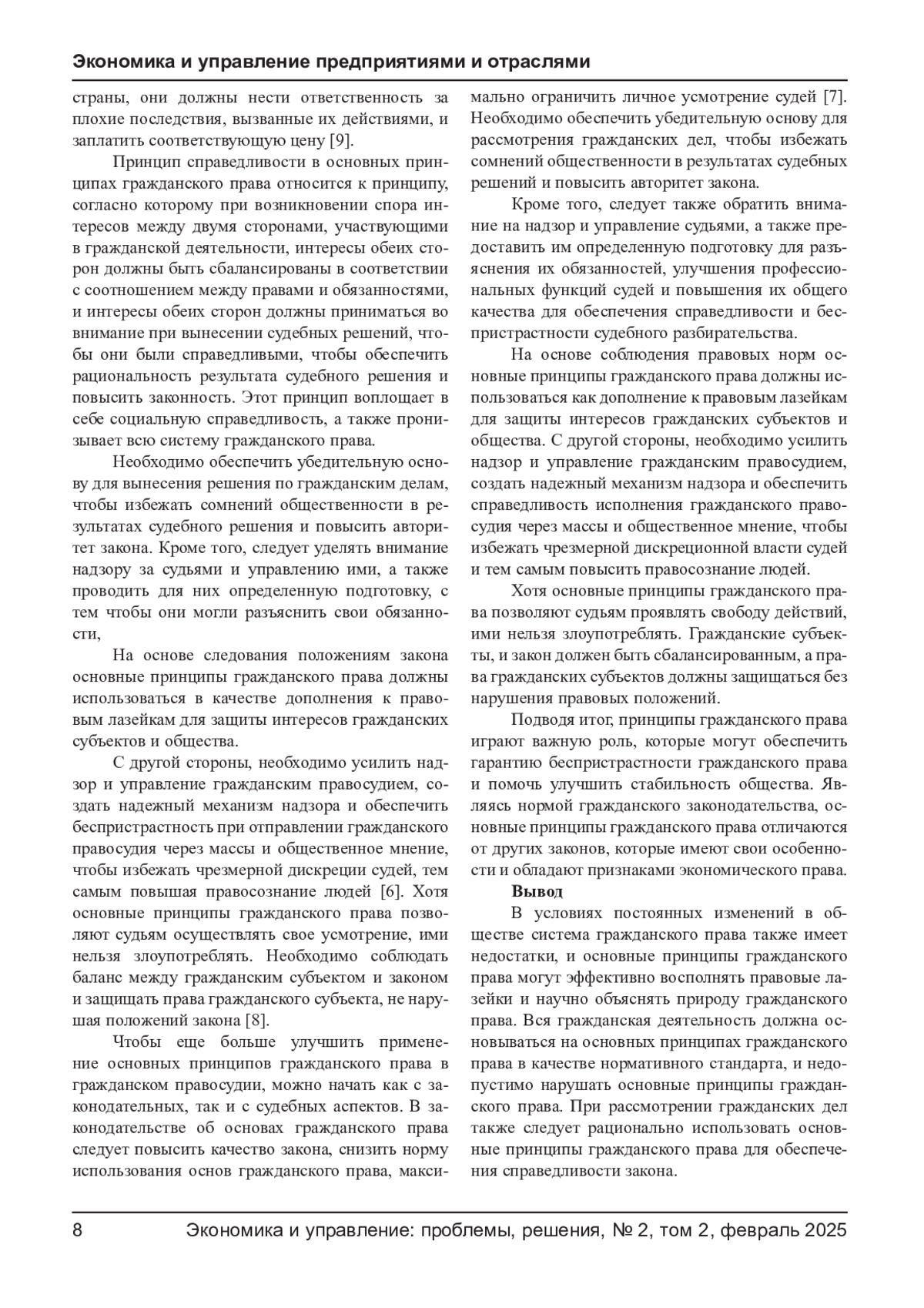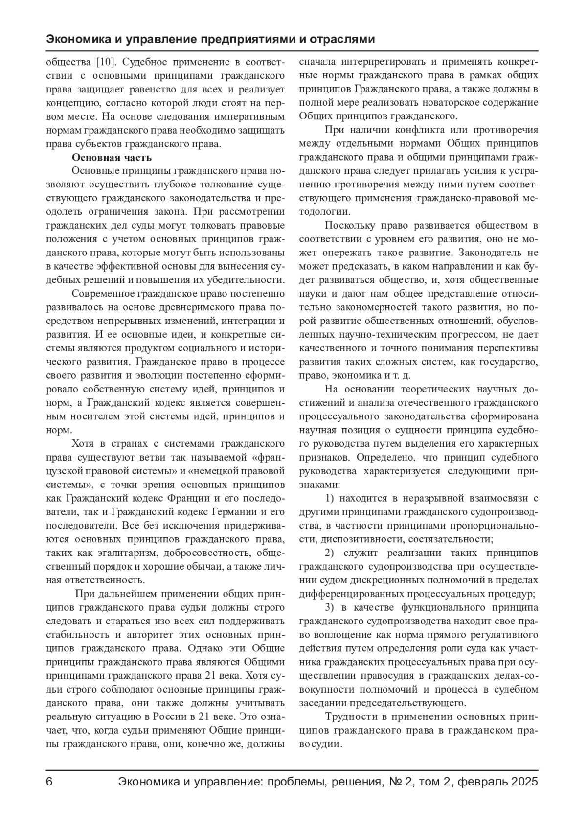 АЛЬХАНОВ Н. М., САЙДУЛАЕВА М. А., ИСИПОВА Л. Р. ОСНОВНЫЕ ПРИНЦИПЫ ГРАЖДАНСКОГО ПРАВА, ПРИМЕНИМЫЕ В ГРАЖДАНСКОМ СУДОПРОИЗВОДСТВЕ // ЭКОНОМИКА И УПРАВЛЕНИЕ: ПРОБЛЕМЫ, РЕШЕНИЯ. 2025. ТОМ 2 № 2