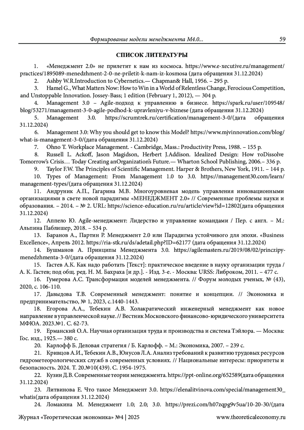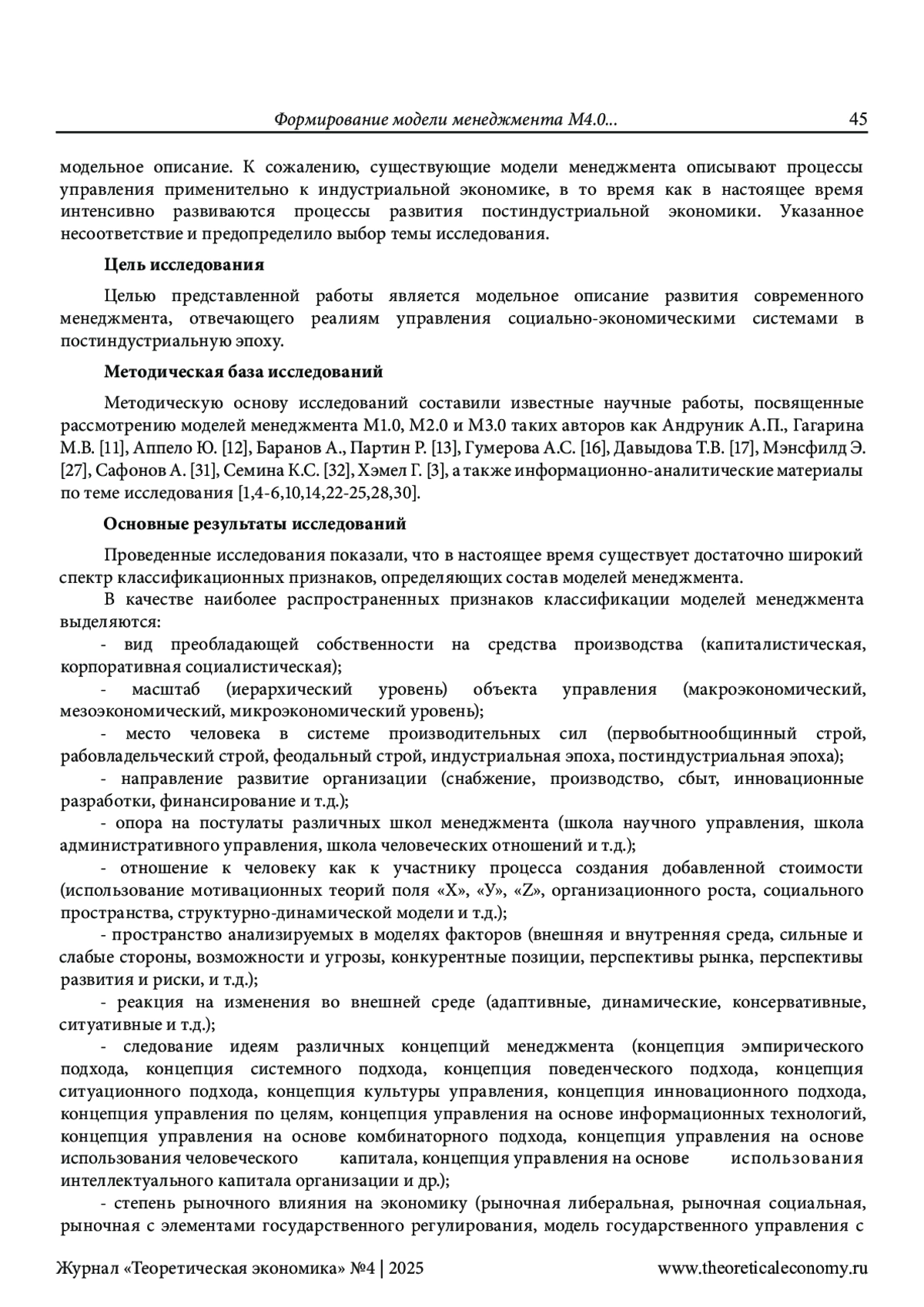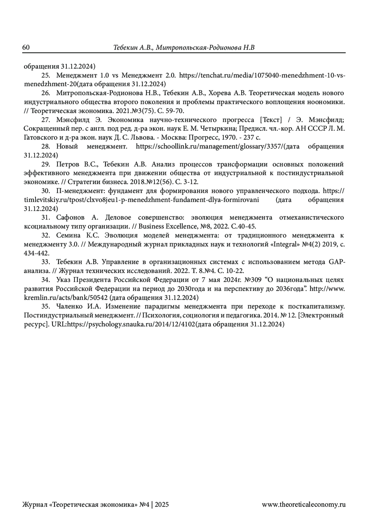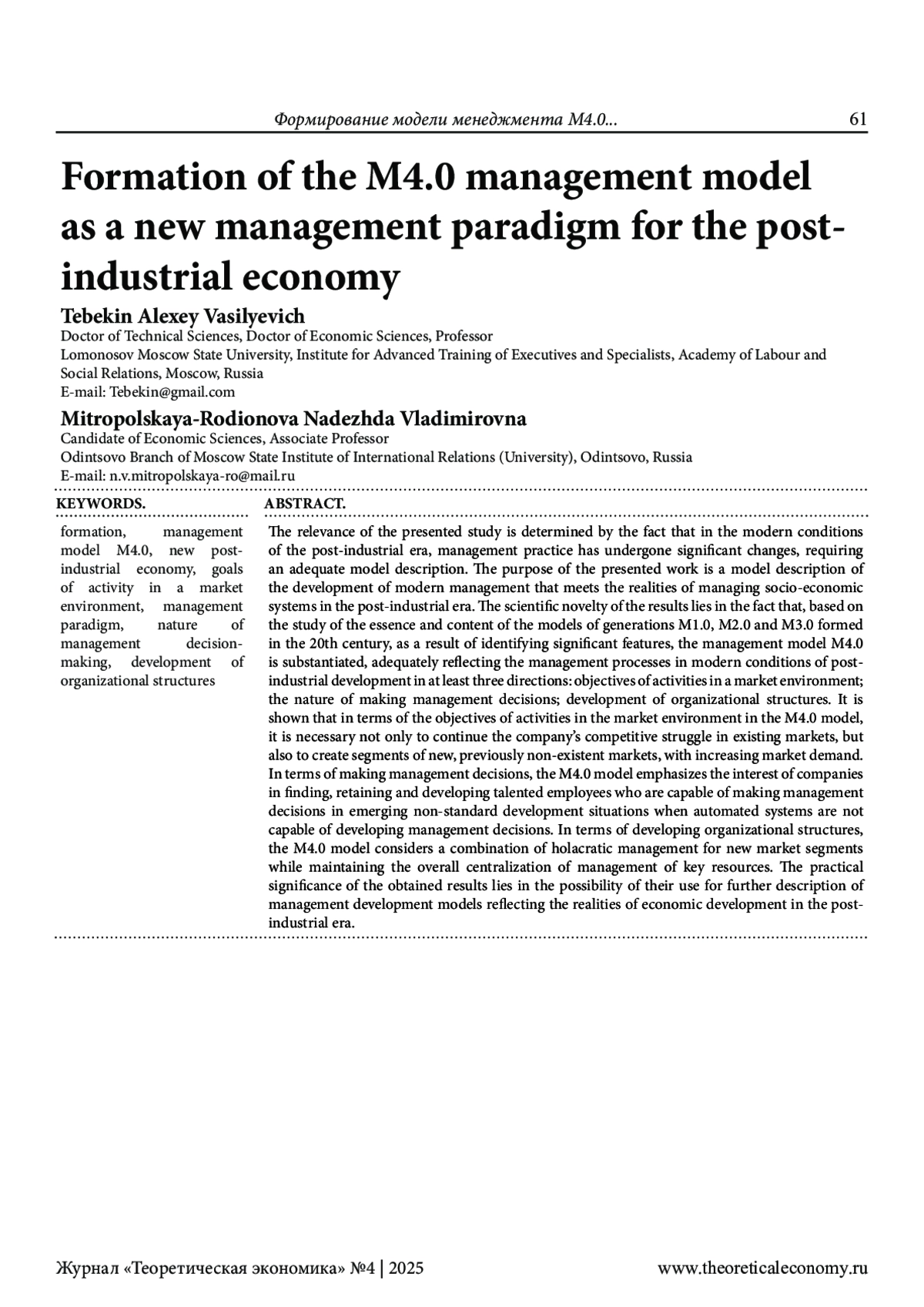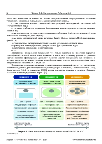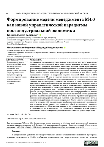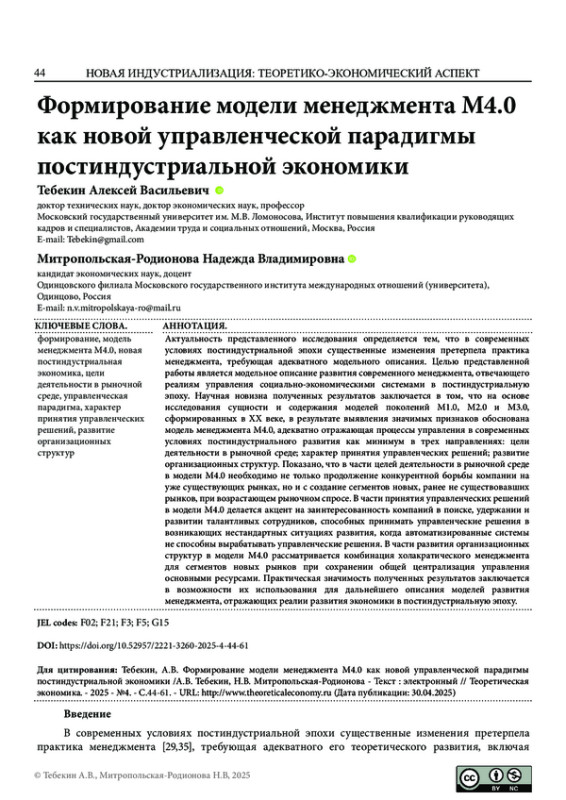 ТЕБЕКИН А. В., МИТРОПОЛЬСКАЯ-РОДИОНОВА Н. В. ФОРМИРОВАНИЕ МОДЕЛИ МЕНЕДЖМЕНТА М4.0 КАК НОВОЙ УПРАВЛЕНЧЕСКОЙ ПАРАДИГМЫ ПОСТИНДУСТРИАЛЬНОЙ ЭКОНОМИКИ // ТЕОРЕТИЧЕСКАЯ ЭКОНОМИКА. 2025. № 4 (124)