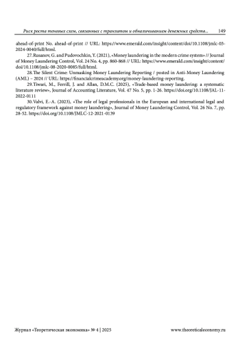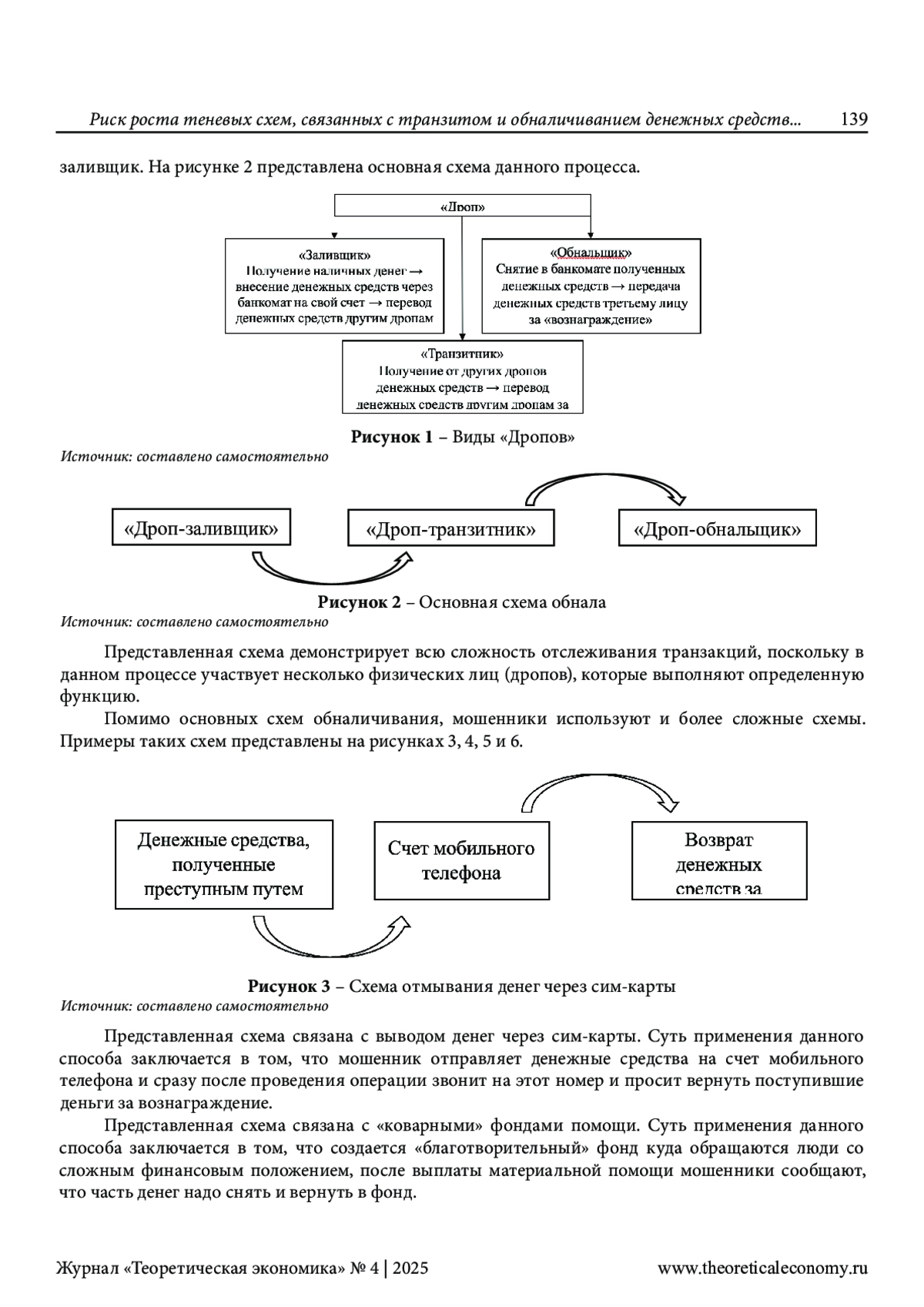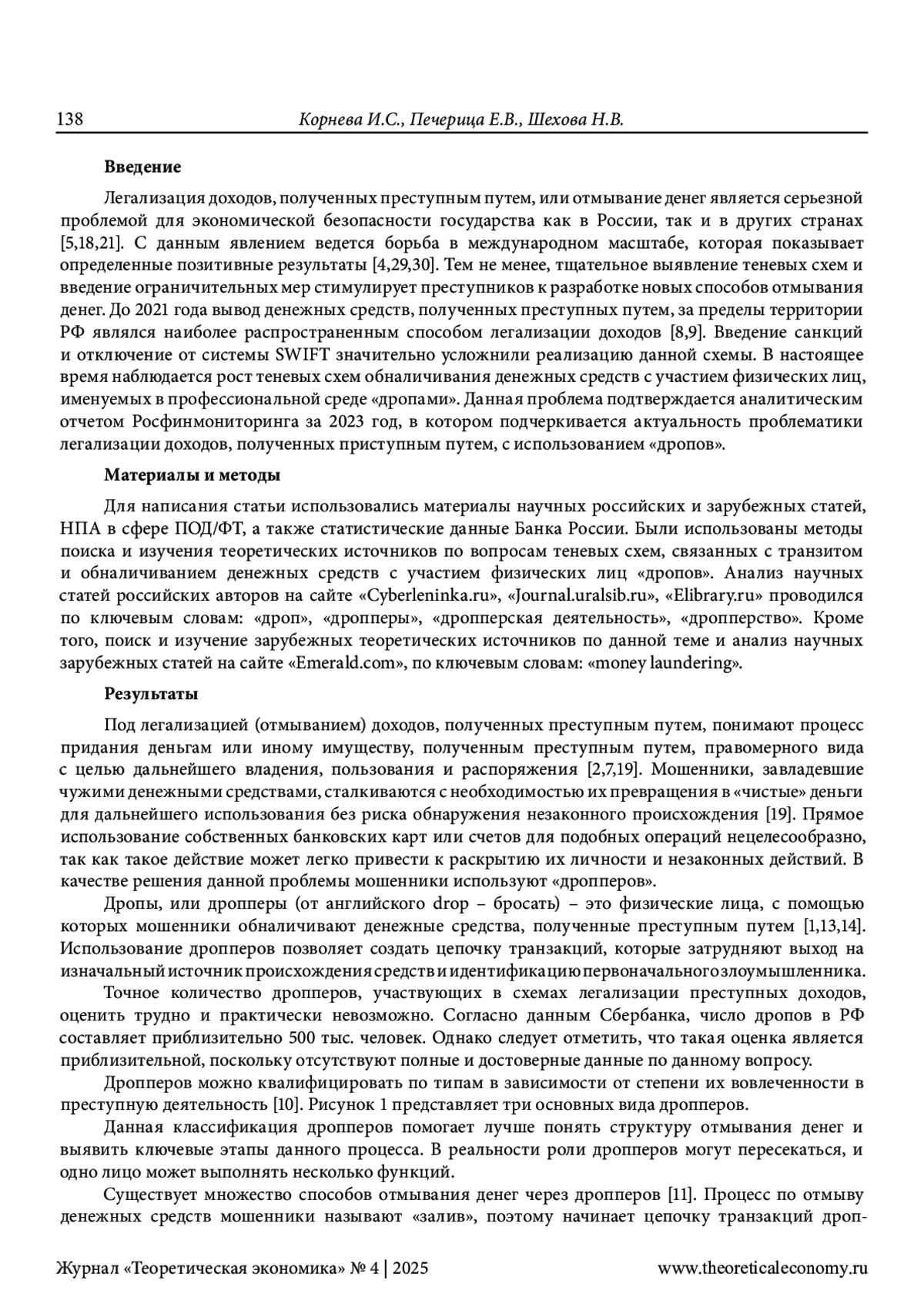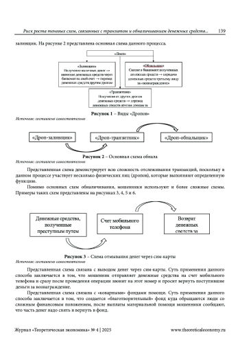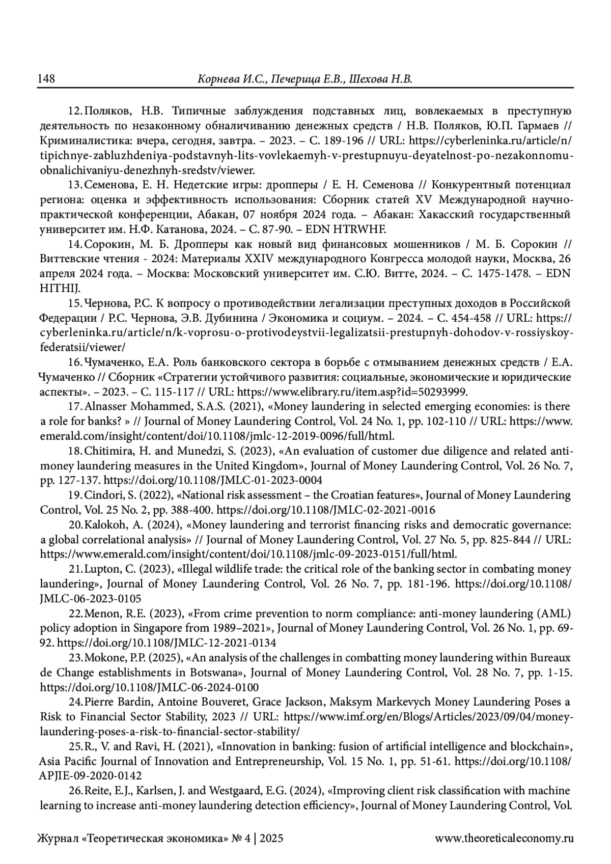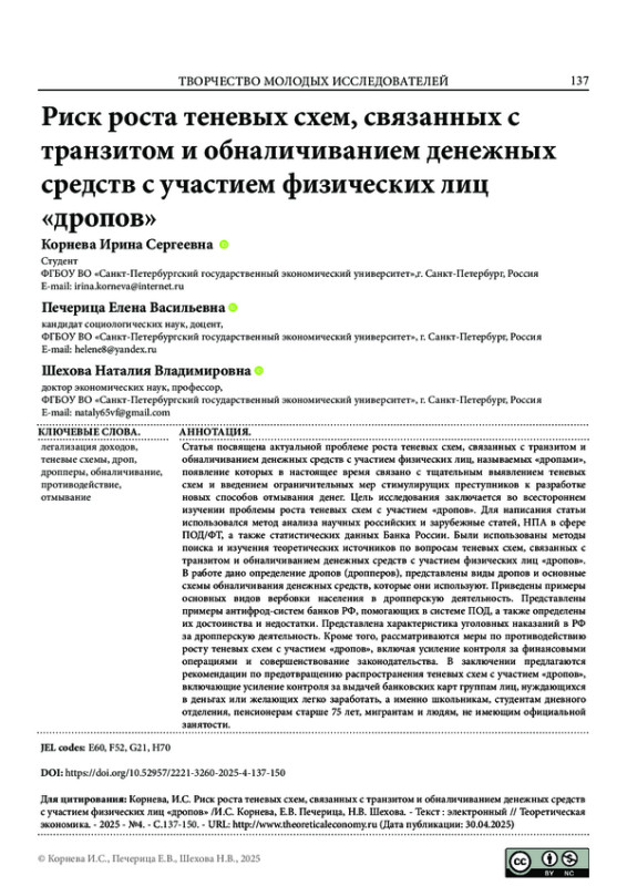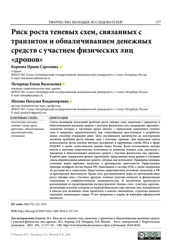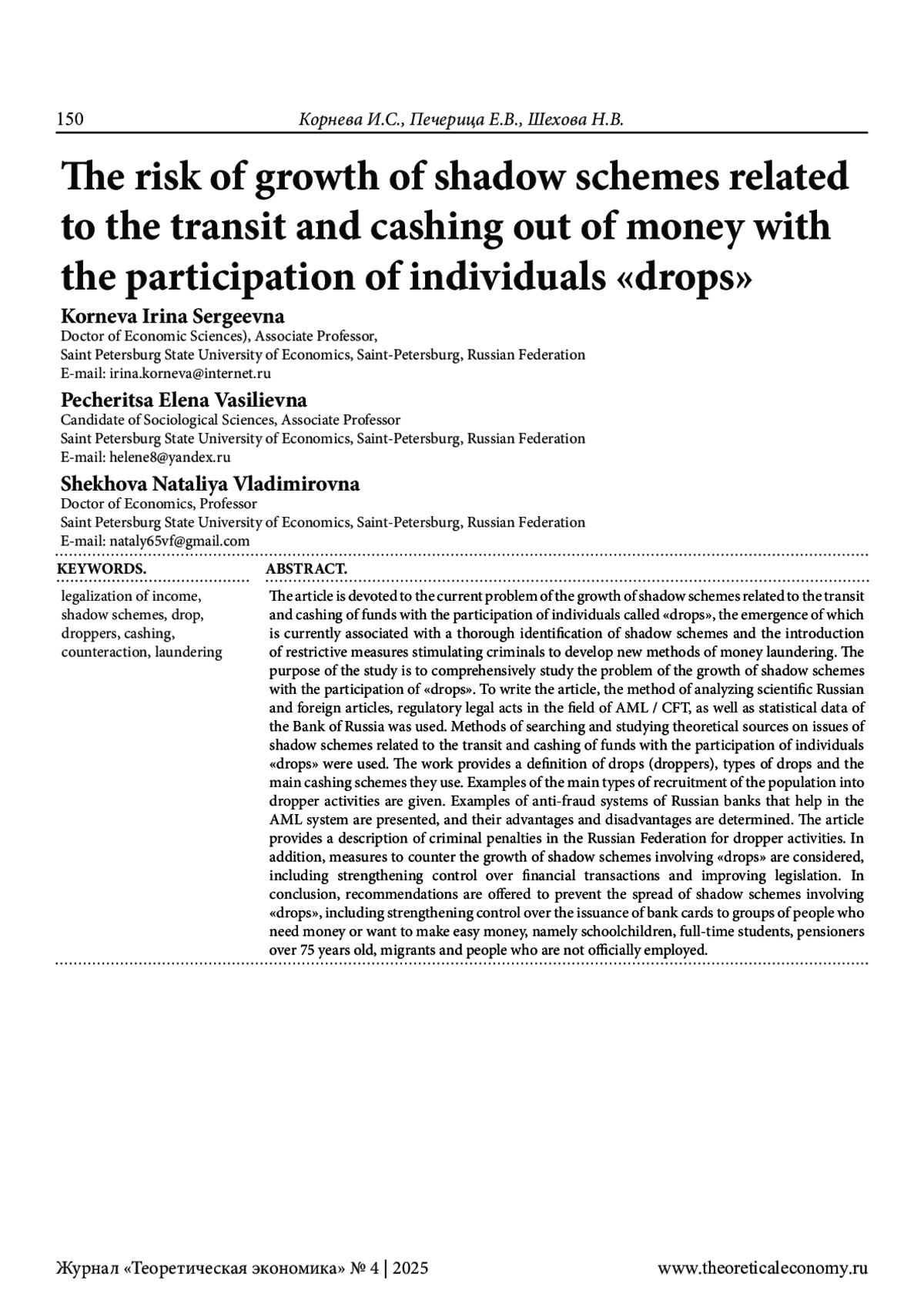 КОРНЕВА И.С., ПЕЧЕРИЦА Е. В., ШЕХОВА Н. В. РИСК РОСТА ТЕНЕВЫХ СХЕМ, СВЯЗАННЫХ С ТРАНЗИТОМ И ОБНАЛИЧИВАНИЕМ ДЕНЕЖНЫХ СРЕДСТВ С УЧАСТИЕМ ФИЗИЧЕСКИХ ЛИЦ «ДРОПОВ» // ТЕОРЕТИЧЕСКАЯ ЭКОНОМИКА. 2025. № 4 (124)