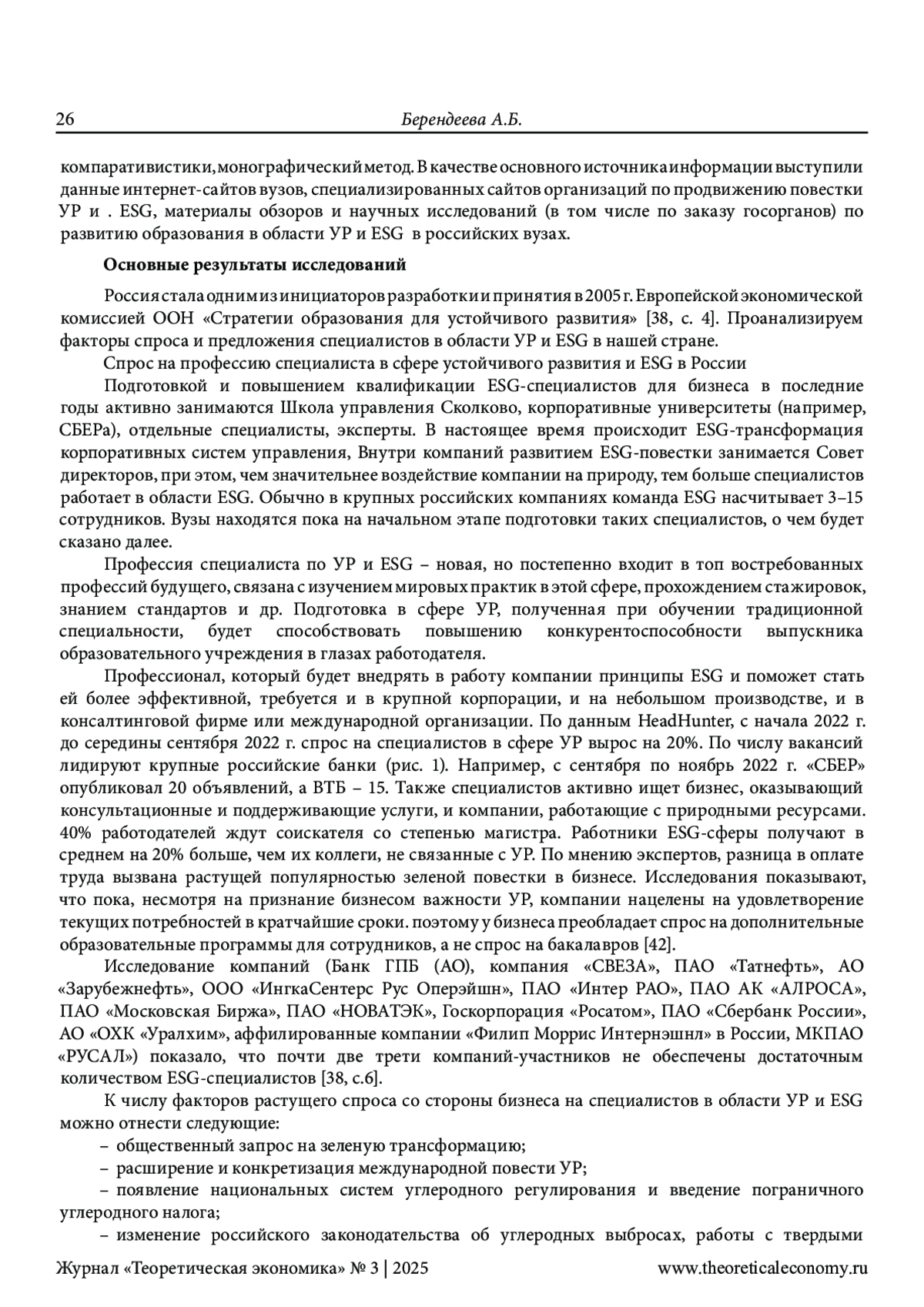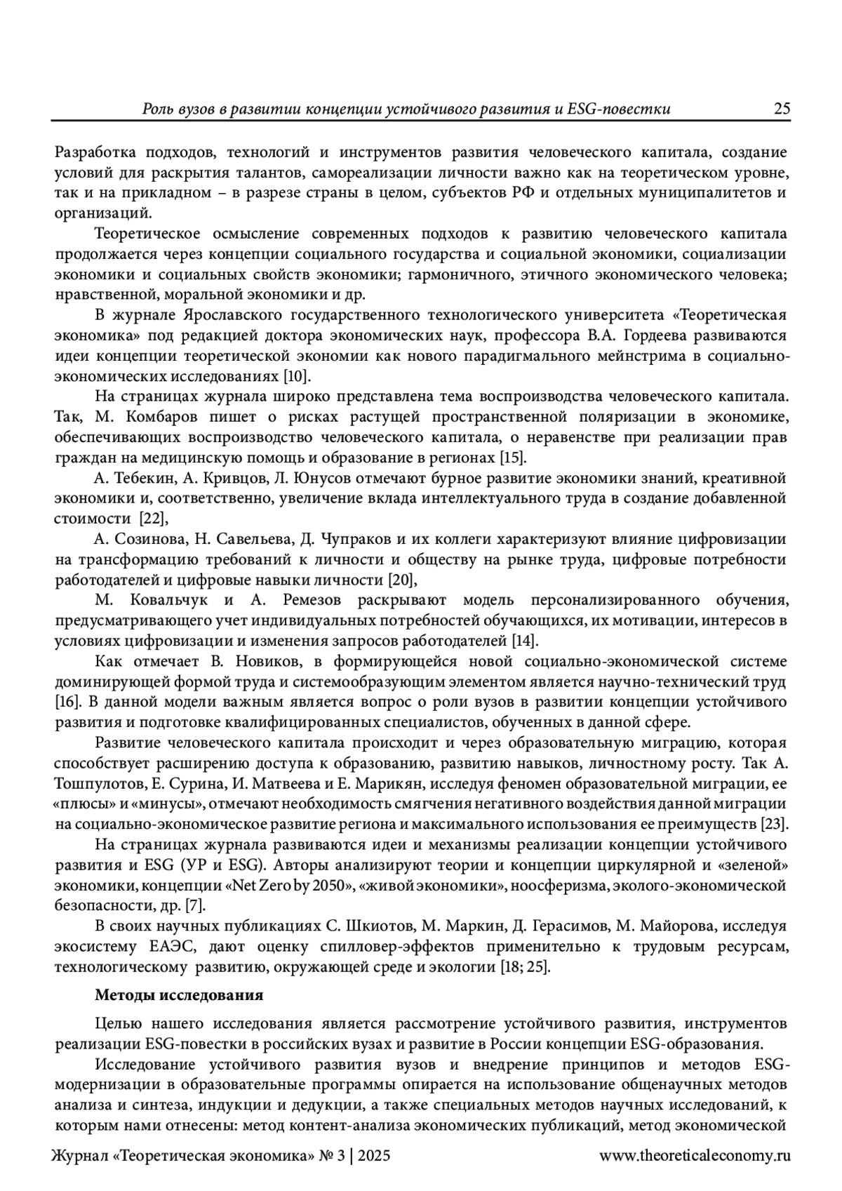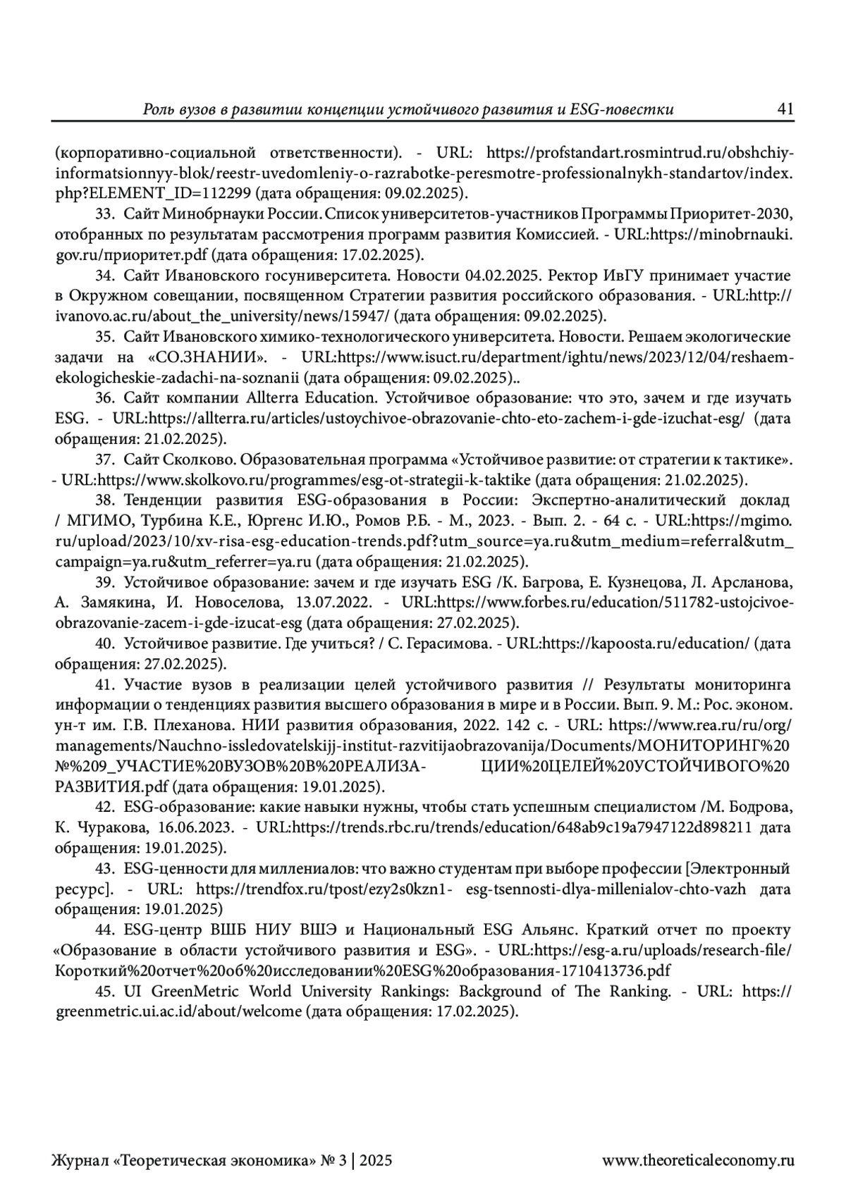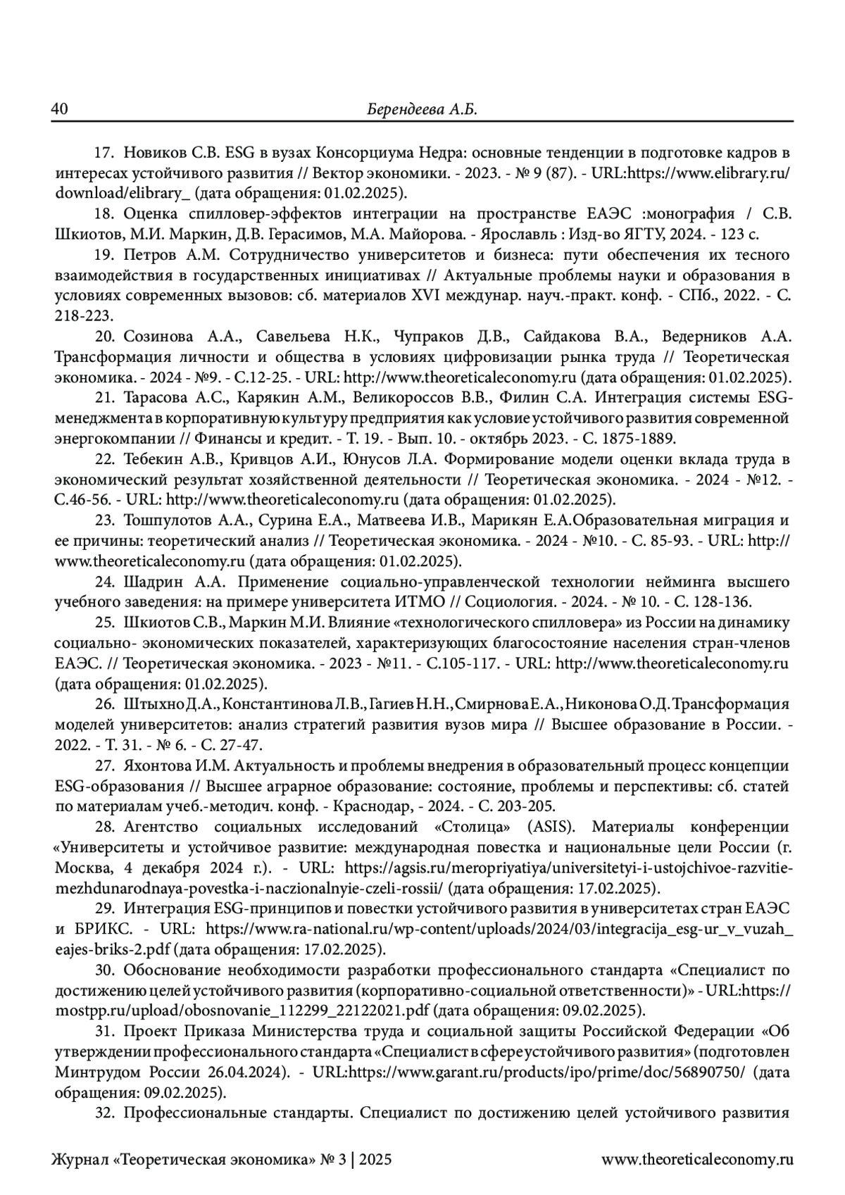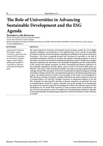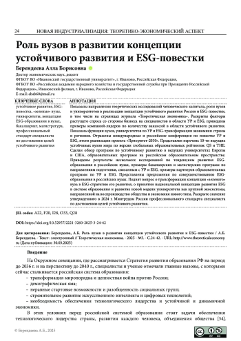 БЕРЕНДЕЕВА А. Б. РОЛЬ ВУЗОВ В РАЗВИТИИ КОНЦЕПЦИИ УСТОЙЧИВОГО РАЗВИТИЯ И ESG-ПОВЕСТКИ // ТЕОРЕТИЧЕСКАЯ ЭКОНОМИКА. 2025. № 3 (123) (11 СТ.)