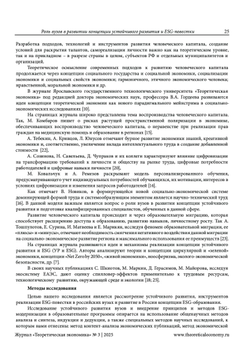 Показаны направления теоретических исследований человеческого капитала, роли вузов и университетов в реализации концепции устойчивого развития России и ESG-повестки, в том числе на страницах журнала «Теоретическая экономика». Раскрыты факторы растущего спроса со стороны бизнеса на специалистов в области УР и ESG, приведены примеры компаний-лидеров по количеству вакансий в области устойчивого развития. Показаны функции вузов, университетов по УР и ESG-трансформации экономики страны и регионов. Отражены международные и российские конференции по повестке УР и ESG, итоги реализации проекта «Приоритет-2030». Представлен перечень 10-ти ведущих устойчивых вузов мира по версии глобальных образовательных рейтингов: QS и THE. Сделан обзор программ по устойчивому развитию в ведущих университетах Европы и США, образовательных программ на российском образовательном пространстве. Приведены результаты нескольких исследований по тенденциям развития ESG-образования в российских вузах, примеры бакалаврских и магистерских программ по направлениям подготовки, связанным с УР и ESG, примеры партнеров образовательных программ по УР и ESG. Представлены предложения по совершенствованию ESG-образования в российских вузах. Поднят вопрос о трансформации концепции «зеленого» вуза в ESG-стратегию его развития, о принятии национальной концепции развития ESG в системе образования и развитие новой модели университета как крупной экосистемы, направленной на воспроизводство общества и экономики нового типа. Раскрыто значение утвержденного в 2024 г. Минтрудом России профессионального стандарта специалиста по достижению целей устойчивого развития.