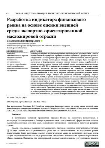 Статья: РАЗРАБОТКА ИНДИКАТОРА ФИНАНСОВОГО РЫНКА НА ОСНОВЕ ОЦЕНКИ ВНЕШНЕЙ СРЕДЫ ЭКСПОРТНО-ОРИЕНТИРОВАННОЙ МАСЛОЖИРОВОЙ ОТРАСЛИ (2025)