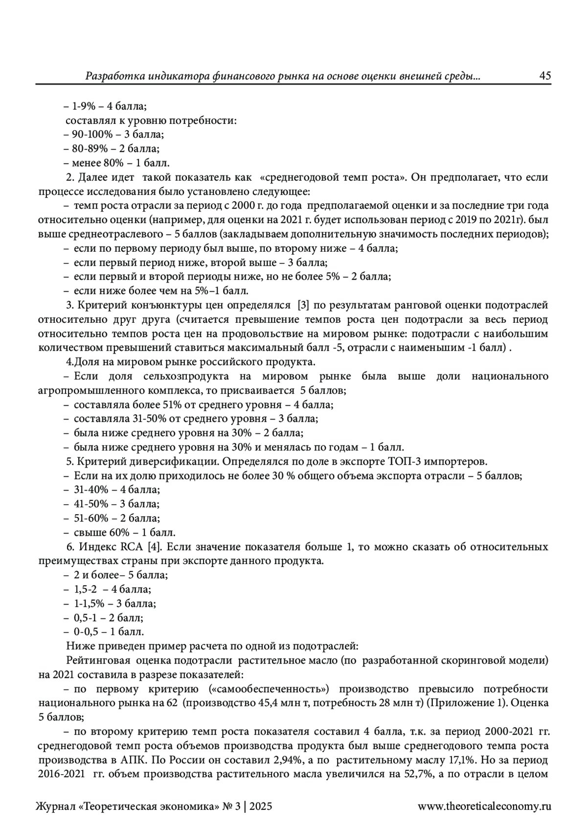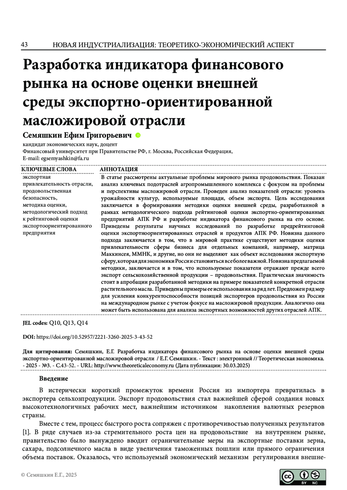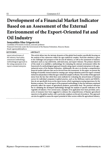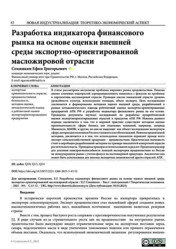 СЕМЯШКИН Е. Г. РАЗРАБОТКА ИНДИКАТОРА ФИНАНСОВОГО РЫНКА НА ОСНОВЕ ОЦЕНКИ ВНЕШНЕЙ СРЕДЫ ЭКСПОРТНО-ОРИЕНТИРОВАННОЙ МАСЛОЖИРОВОЙ ОТРАСЛИ // ТЕОРЕТИЧЕСКАЯ ЭКОНОМИКА. 2025. № 3 (123) (11 СТ.)