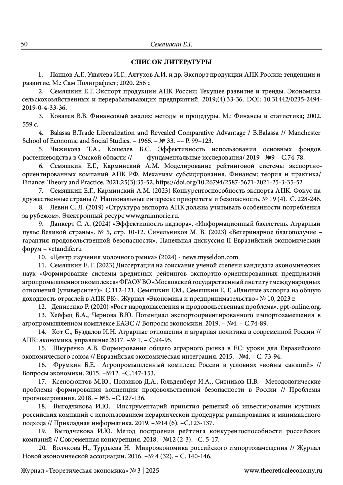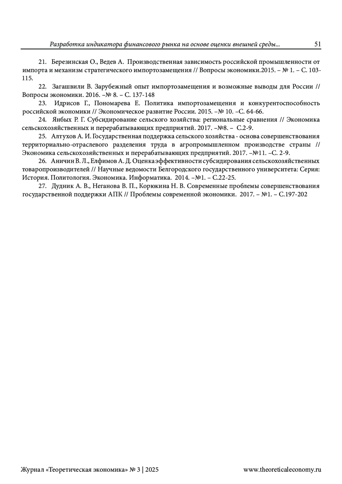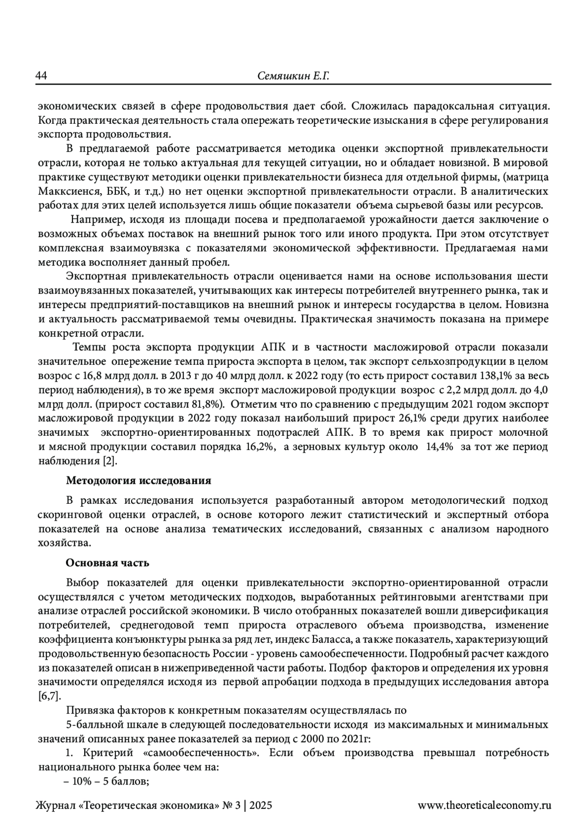 СЕМЯШКИН Е. Г. РАЗРАБОТКА ИНДИКАТОРА ФИНАНСОВОГО РЫНКА НА ОСНОВЕ ОЦЕНКИ ВНЕШНЕЙ СРЕДЫ ЭКСПОРТНО-ОРИЕНТИРОВАННОЙ МАСЛОЖИРОВОЙ ОТРАСЛИ // ТЕОРЕТИЧЕСКАЯ ЭКОНОМИКА. 2025. № 3 (123) (11 СТ.)