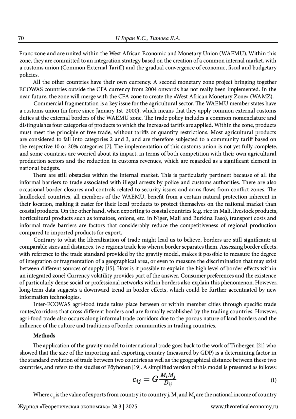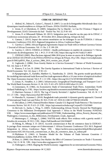 6. Carrère, C. (2013). UEMOA et CEMAC: Quelle performance en matière de commerce ? // Revue d’économie du développement. Vol. 1. № 21. Р. 33-60. DOI: 10.3917/edd.271.0033