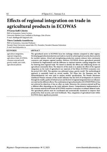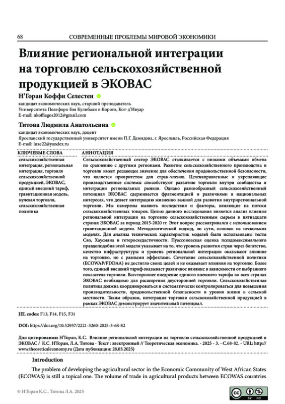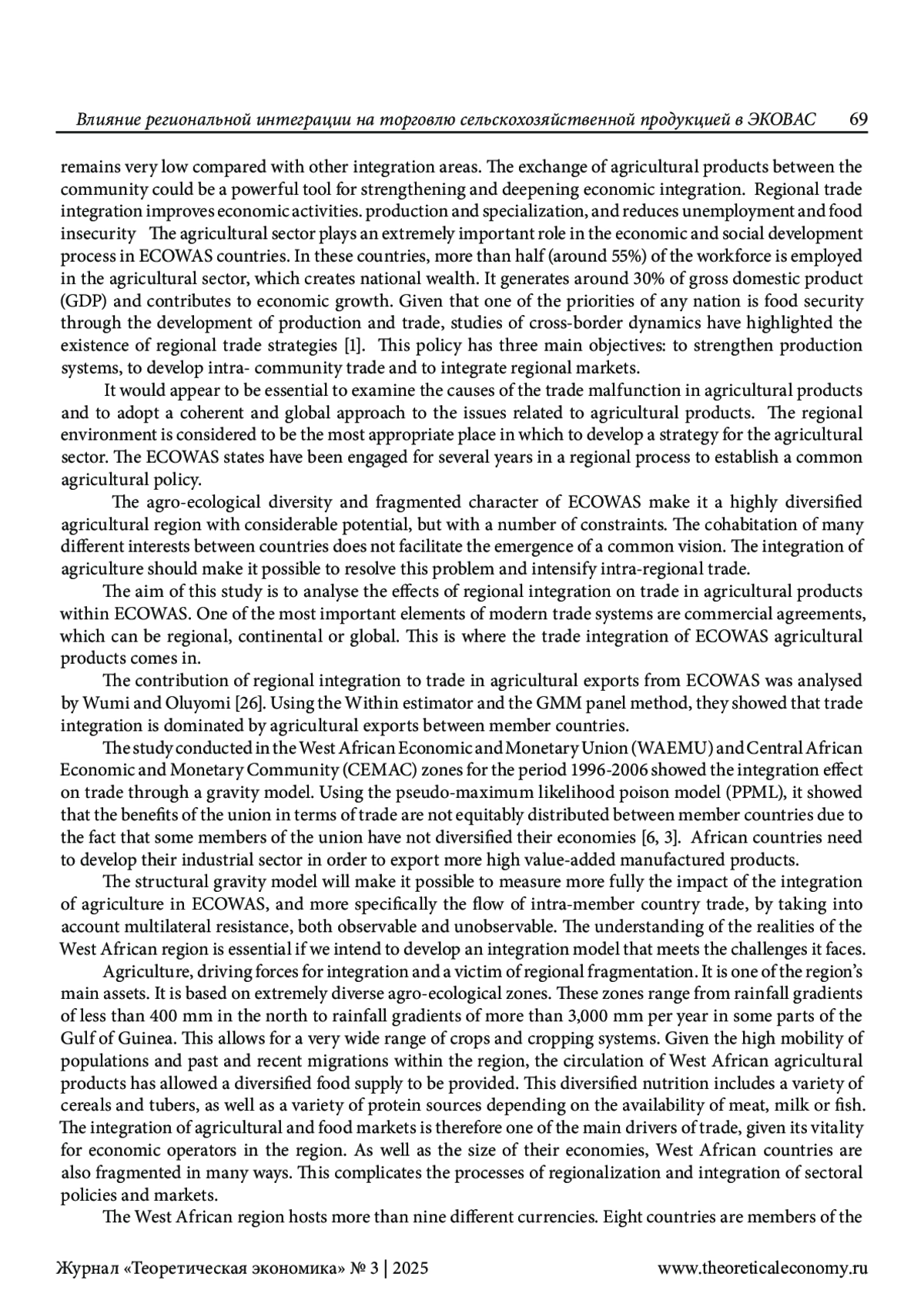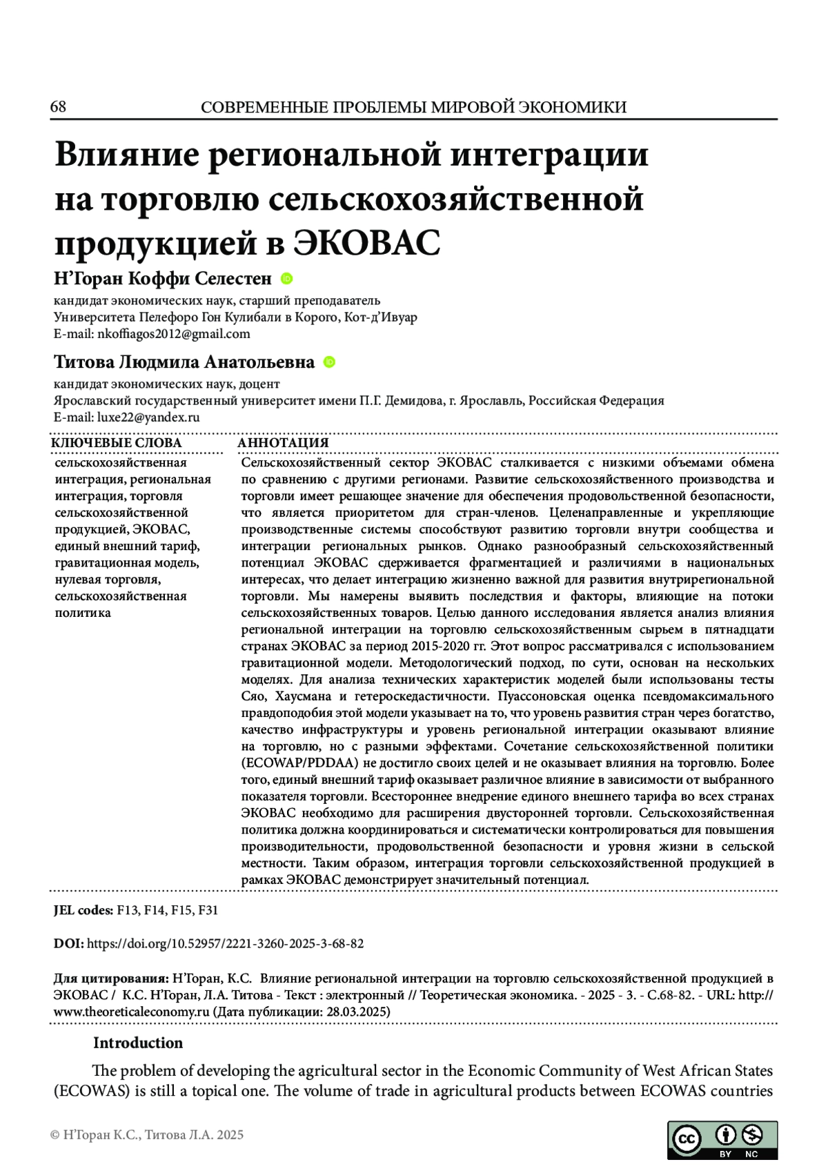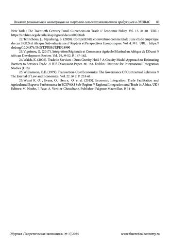 26. Wumi K. O., Evans, O., Henry, O. et al. (2015). Economic Integration, Trade Facilitation and Agricultural Exports Performance in ECOWAS Sub-Region // Regional Integration and Trade in Africa. UK / Editors: M. Ncube, I. Faye, A. Verdier-Chouchane. Publisher: Palgrave Macmillan. Р. 31-46.