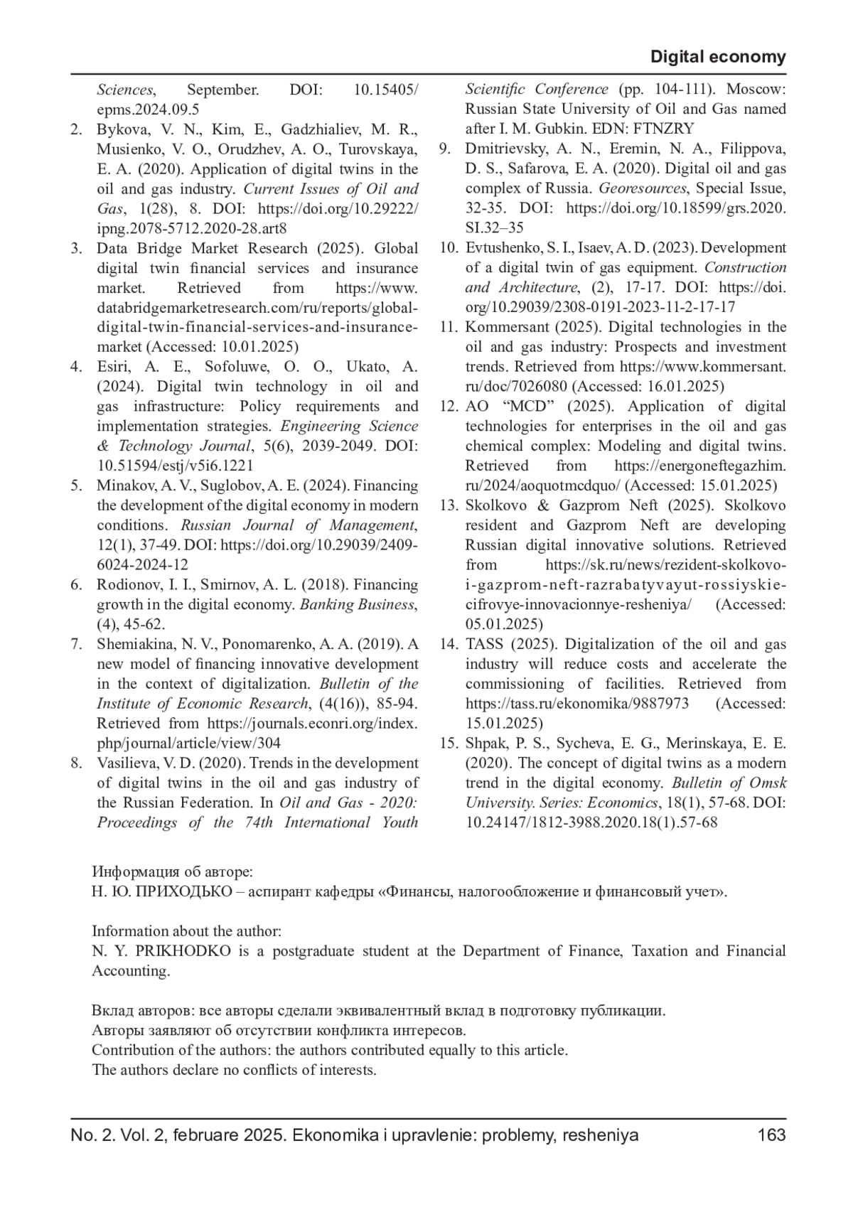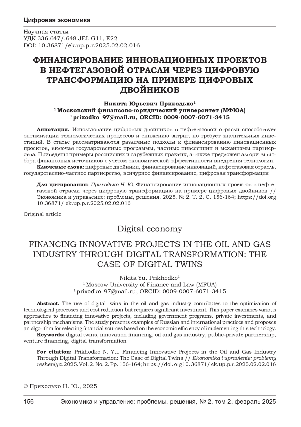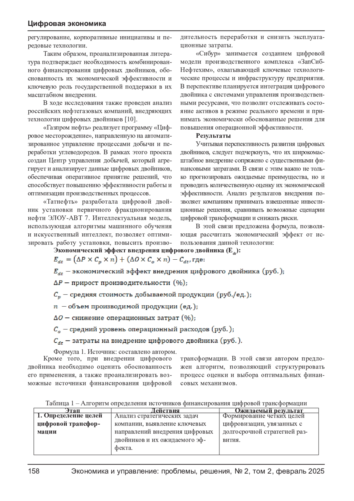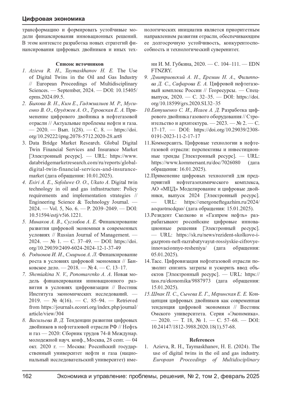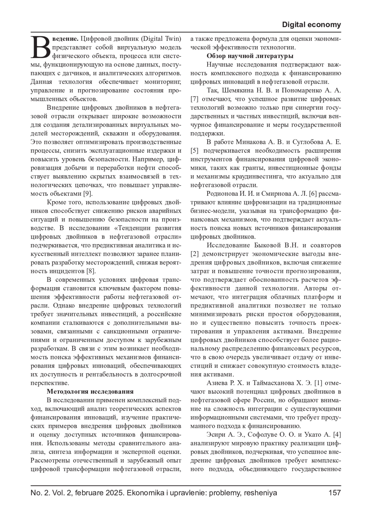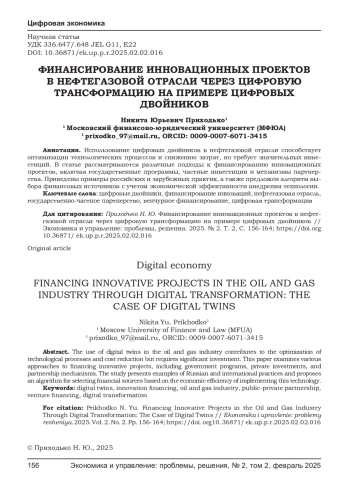 ПРИХОДЬКО Н. Ю. ФИНАНСИРОВАНИЕ ИННОВАЦИОННЫХ ПРОЕКТОВ В НЕФТЕГАЗОВОЙ ОТРАСЛИ ЧЕРЕЗ ЦИФРОВУЮ ТРАНСФОРМАЦИЮ НА ПРИМЕРЕ ЦИФРОВЫХ ДВОЙНИКОВ // ЭКОНОМИКА И УПРАВЛЕНИЕ: ПРОБЛЕМЫ, РЕШЕНИЯ. 2025. ТОМ 2 № 2