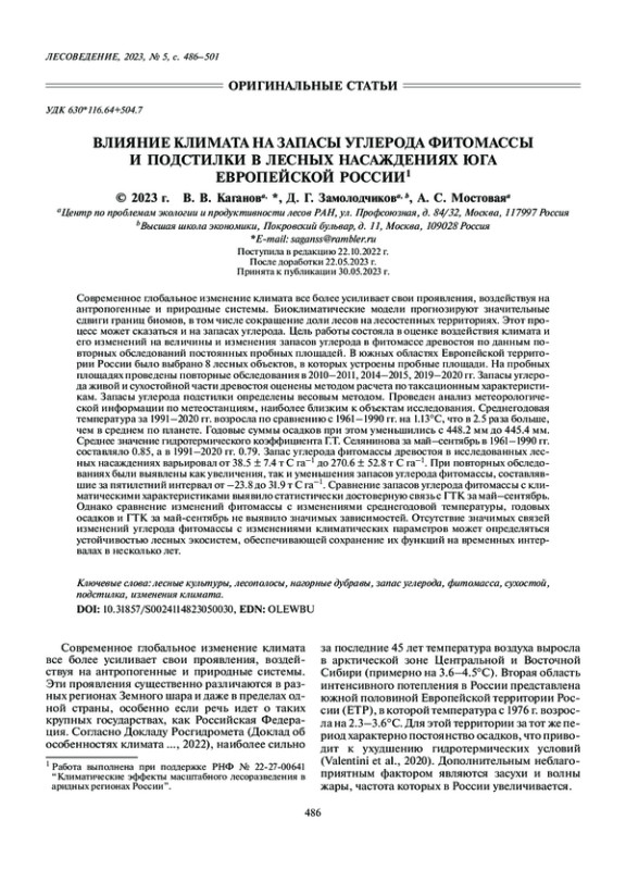 Современное глобальное изменение климата все более усиливает свои проявления, воздействуя на антропогенные и природные системы. Биоклиматические модели прогнозируют значительные сдвиги границ биомов, в том числе сокращение доли лесов на лесостепных территориях. Этот процесс может сказаться и на запасах углерода. Цель работы состояла в оценке воздействия климата и его изменений на величины и изменения запасов углерода в фитомассе древостоя по данным повторных обследований постоянных пробных площадей. В южных областях Европейской территории России было выбрано 8 лесных объектов, в которых устроены пробные площади. На пробных площадях проведены повторные обследования в 2010–2011, 2014–2015, 2019–2020 гг. Запасы углерода живой и сухостойной части древостоя оценены методом расчета по таксационным характеристикам. Запасы углерода подстилки определены весовым методом. Проведен анализ метеорологической информации по метеостанциям, наиболее близким к объектам исследования. Среднегодовая температура за 1991–2020 гг. возросла по сравнению с 1961–1990 гг. на 1.13°С, что в 2.5 раза больше, чем в среднем по планете. Годовые суммы осадков при этом уменьшились с 448.2 мм до 445.4 мм. Среднее значение гидротермического коэффициента Г. Т. Селянинова за май–сентябрь в 1961–1990 гг. составляло 0.85, а в 1991–2020 гг. 0.79. Запас углерода фитомассы древостоя в исследованных лесных насаждениях варьировал от 38.5 ± 7.4 т С га–1 до 270.6 ± 52.8 т С га–1. При повторных обследованиях были выявлены как увеличения, так и уменьшения запасов углерода фитомассы, составлявшие за пятилетний интервал от –23.8 до 31.9 т С га –1. Сравнение запасов углерода фитомассы с климатическими характеристиками выявило статистически достоверную связь с ГТК за май–сентябрь. Однако сравнение изменений фитомассы с изменениями среднегодовой температуры, годовых осадков и ГТК за май-сентябрь не выявило значимых зависимостей. Отсутствие значимых связей изменений углерода фитомассы с изменениями климатических параметров может определяться устойчивостью лесных экосистем, обеспечивающей сохранение их функций на временных интервалах в несколько лет