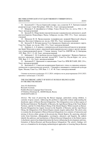 Несмотря на многочисленные усилия проблема сохранения и развития бурятского языка все еще остается достаточно острой, особенно в детской среде [1, с. 21]. В целях определения оптимальных путей и методов обучения бурятскому языку в аспекте развития бурятско-русского, русско-бурятского двуязычия необходимо изучить влияние контактирующих языков на формирование активного билингвизма в диахроническом аспекте.