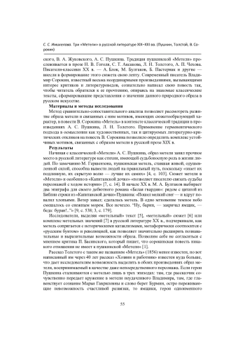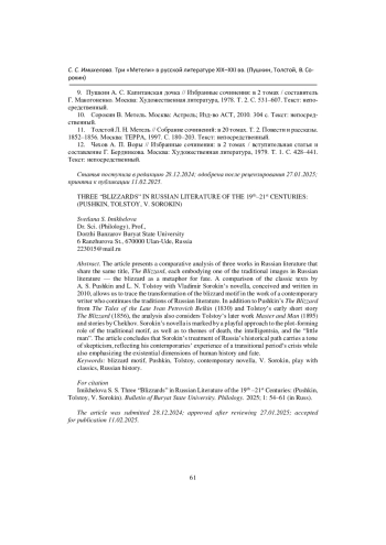 Статья посвящена сравнительному анализу трех произведений русской литературы с одним и тем же названием, в которых воплощен один из традиционных образов русской литературы - образ метели, тождественный понятию судьбы. Сравнение классических текстов А. С. Пушкина, Л. Н. Толстого с повестью Владимира Сорокина, задуманной и написанной в 2010 г., позволяет проследить изменение образа метели и «метельных» мотивов в творчестве современного писателя как продолжателя традиций русской литературы. К анализу современного произведения привлекается не только «Метель» из пушкинского цикла «Повести покойного Ивана Петровича Белкина» (1830) и одноименный ранний рассказ Толстого «Метель» (1856), но и зрелое толстовское произведение «Хозяин и работник» (1895), а также рассказы Чехова. В повести В. Сорокина отмечается игровая позиция современного писателя по отношению к сюжетообразующей роли традиционного мотива, к теме смерти, образам интеллигента и «маленького человека». Делается вывод о таком решении Сорокиным темы исторического пути России, которое содержит скептическую интонацию автора, переживающего со своими современниками кризисность переходного времени и в то же время подчеркивающего бытийный, экзистенциальный смысл во взаимоотношениях человека и истории.