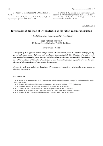 2. Бобоев Т. Фотомеханическое разрушение полимеров. – Душанбе. Матбуот, 2000. Прикладная физика, 2020, № 5 96
