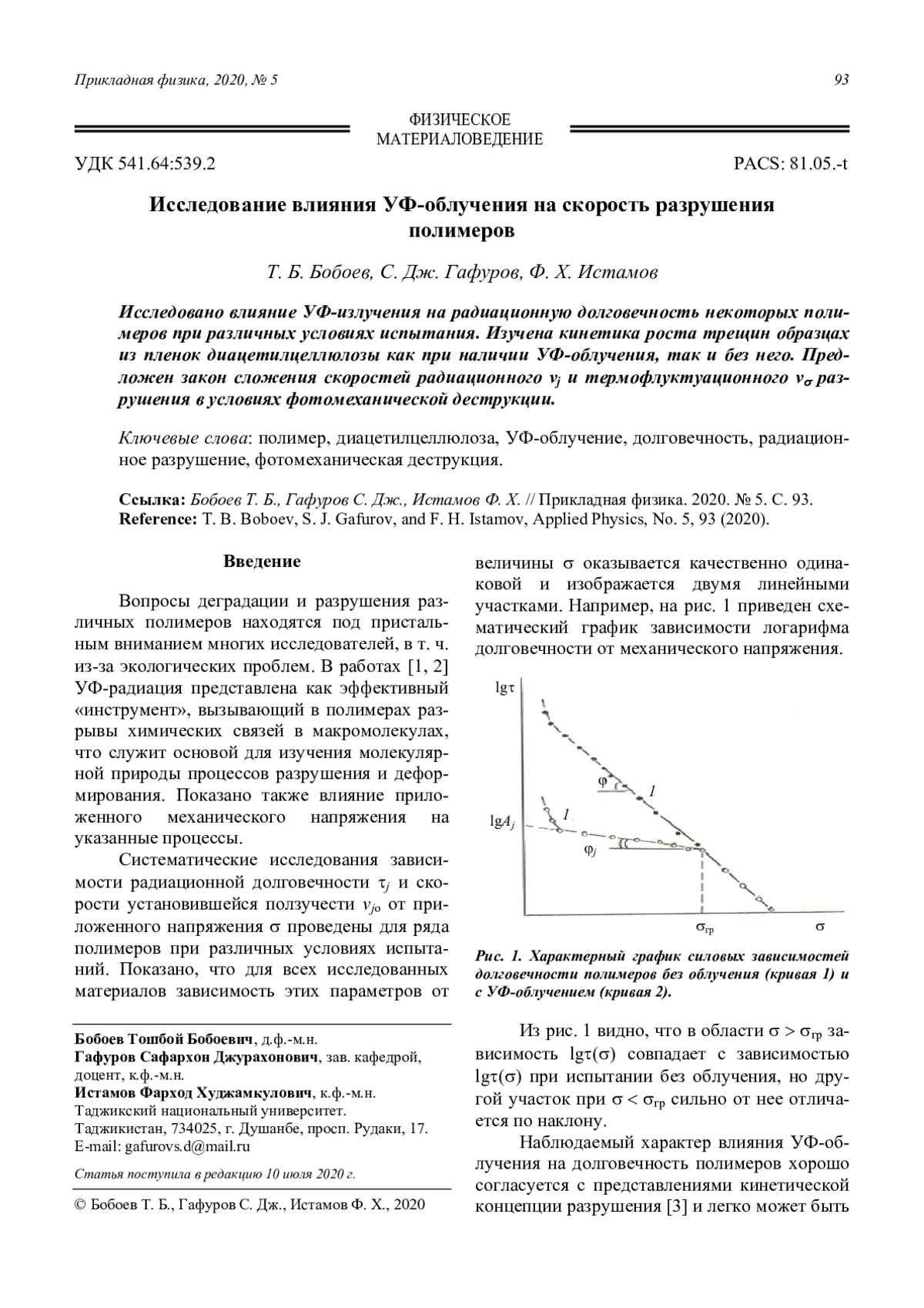 Бобоев Т. Б., Гафуров С. Дж., Истамов Ф. Х. Исследование влияния УФ-облучения на скорость разрушения полимеров 93