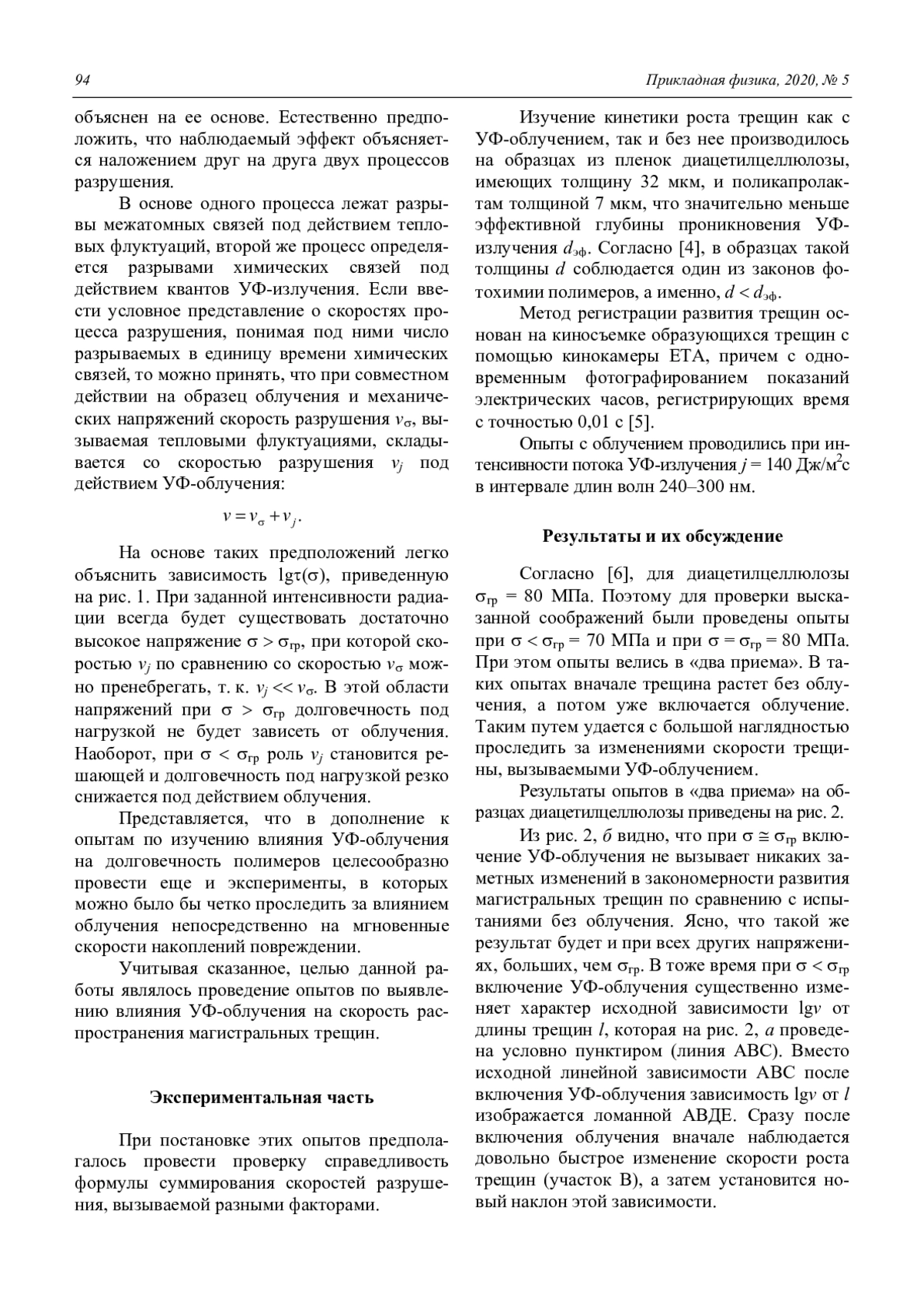 При достаточно высоком напряжении ( гр) ролью vj можно пренебречь, и процесс разрушения целиком определяется скоростью v. При средних напряжениях ( гр) начало разрушения развивается за счет радиационных эффектов, но окончание разрушения всегда происходит за счет термофлуктуационных процессов. Иначе говоря, УФ-облучение «надрезает» образец, а термофлуктуационный процесс «подхватывает» и заканчивает разрушение.