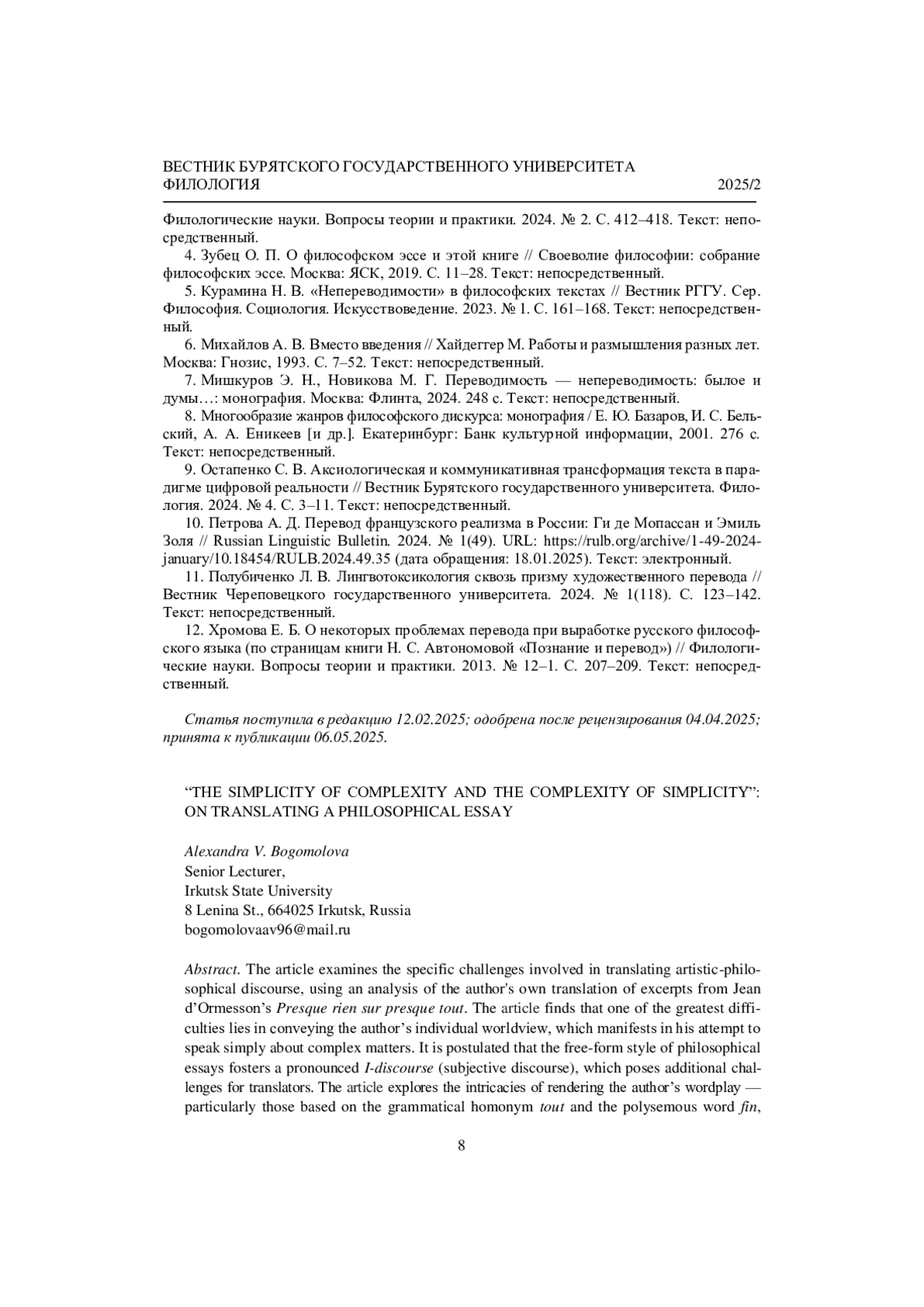 5. Курамина Н. В. “Непереводимости” в философских текстах // Вестник РГГУ. Сер. Философия. Социология. Искусствоведение. 2023. № 1. С. 161-168. Текст: непосредственный.