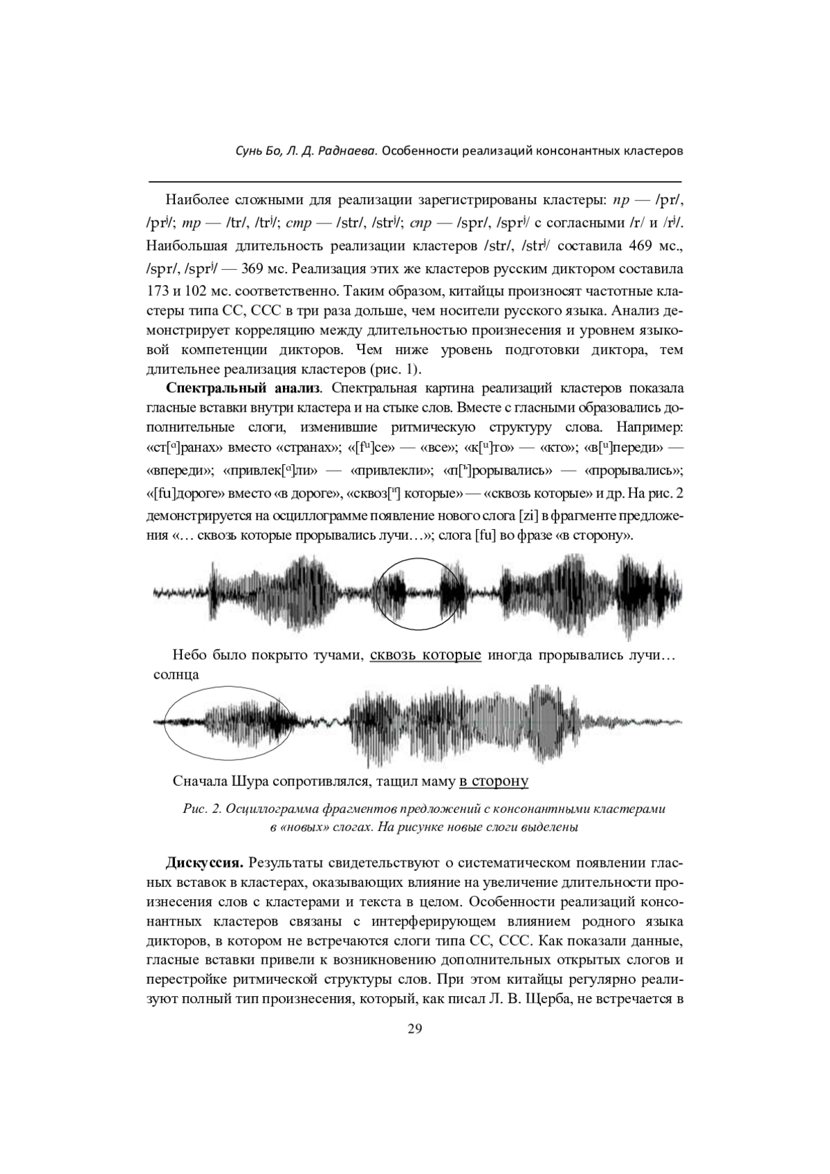 В статье анализируются особенности употребления слов с консонантными кластерами в речи информантов-китайцев, изучающих русский язык. Рассматривается 170 консонантных кластеров в составе текста. В речи китайцев наблюдается замена звуков в сочетаниях согласных, выпадение согласных, гласные вставки, появление дополнительных слогов, изменяющих ритмическую структуру русского слова, а также преобладание полного типа произнесения кластеров. Полученные данные могут быть использованы для совершенствования автоматических систем распознавания речи и в практике преподавания русского языка как иностранного. Результаты исследования, проведенного на основе анализа записей русского текста в китайском произнесении, выявили особенности реализаций консонантных кластеров.