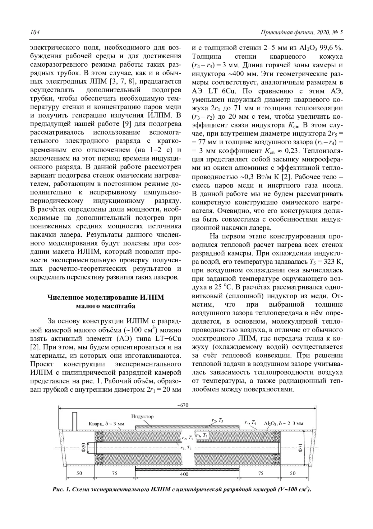 Численным методом показано, что в ИЛПМ с небольшим рабочим объемом (102 см3), используя дополнительный подогрев трубки, можно получить устойчивую и эффективную генерацию излучения ИЛПМ на уровне нескольких ватт с физическим КПД (1,5–3) %. Определены основные электрические, технические и тепловые параметры экспериментального макета. Реализация такого устройства позволит провести экспериментальную проверку полученных расчетнотеоретических результатов и оценить возможность использования индукционного разряда для накачки лазеров на парах металлов.