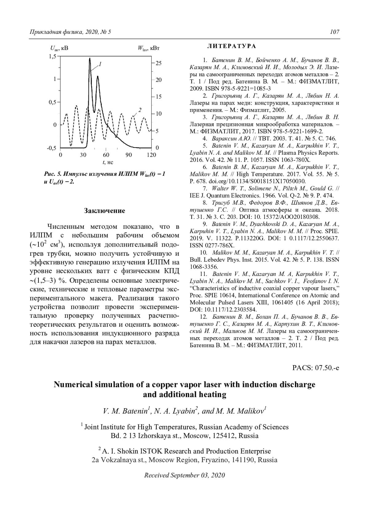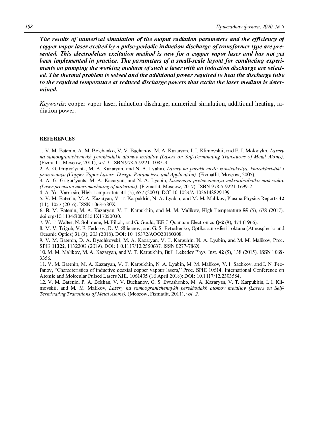 11. Batenin V. M., Kazaryan M. A, Karpukhin V. T., Lyabin N. A., Malikov M. M., Sachkov V. I., Feofanov I. N. “Characteristics of inductive coaxial copper vapour lasers,”