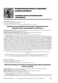 Рассматриваются психологические характеристики профессиональной рефлексии обучающихся профессиональных образовательных организаций — будущих специалистов среднего звена. Цель — выявление психологических особенностей профессиональной рефлексии обучающихся профессиональных образовательных организаций. Материалы и методы. В исследовании использовались следующие методики: «Определение уровня развития рефлексивности» А. В. Карпова, «Уровень выраженности и направленности рефлексии» М. Гранта, «Дифференцированный тип рефлексии» Д. А. Леонтьева, Е. Н. Осина. Выборку составили 40 обучающихся профессиональных образовательных организаций. Результаты и обсуждение. Выделяются психологические характеристики профессиональной рефлексии обучающихся медицинского и педагогического колледжей, определяющие их представление о себе как будущем профессионале. Приводятся данные анализа категории «профессиональная рефлексия», а также результаты сравнительного анализа особенностей профессиональной рефлексии обучающихся, полученные нами в процессе эмпирического исследования. Выводы. Профессиональная рефлексия обучающихся профессиональных образовательных организаций имеет особенности, к которым можно отнести способность анализировать и оценивать свои «шаги» в профессию, умение сопереживать и проникать во внутренний мир другого человека, проявлять эмпатию, толерантность, чуткость, способность осознавать и осмысливать свои переживания по поводу вхождения в профессию, прогнозировать последствия собственных профессиональных действий.