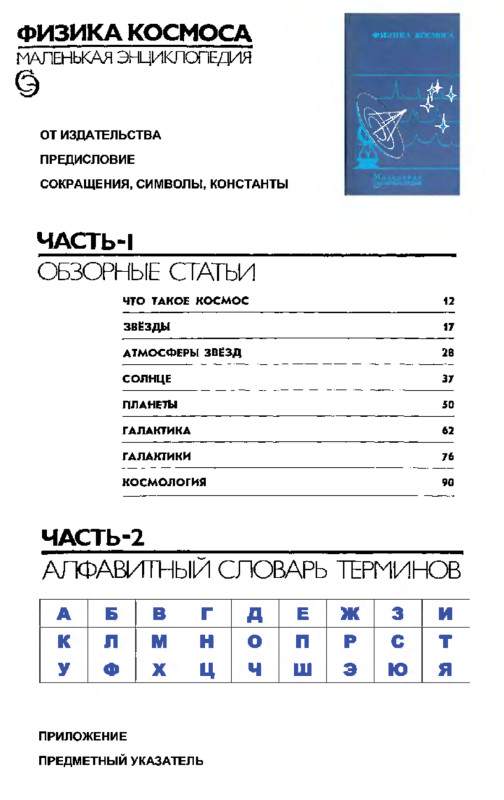 Маленькая энциклопедия «Физика космоса» знакомит читателей с основными проблемами и достижениями астрофизики — бурно развивающейся науки о физических явлениях во Вселенной. Исходным экспериментальным материалом для астрофизики служат данные наземной и внеатмосферной астрономии, а теоретической основой коны физики, установленные и проверенные в земных условиях. В круг интересов астрофизики входит изучение не только традиционных астрономических объектов — Солнца, Солнечной системы, звёзд, их систем и т. д., но и явлений микромира, свойств и взаимодействий мельчайших частиц вещества (элементарных частиц, атомов, молекул), от которых существенно зависят многие свойства космических тел и Вселенной в целом.