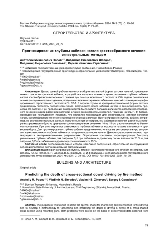 Целью данной работы является выбор оптимальной формы заточки нагелей, предназначенных для огнестрельной забивки, и разработка методики оценки и прогнозирования глубины забивки нагеля крестообразного поперечного сечения при помощи монтажного пистолета. Обе задачи решались на основе экспериментальных данных, полученных при многократном забивании нагелей с помощью модифицированного строительного пистолета ПЦ 52-1. В первом случае за критерий оптимальной формы заточки принимались плотность посадочного гнезда, получаемого после забивки нагеля, и технологичность процесса его заточки. При проведении экспериментов было забито большое количество нагелей крестообразного сечения с самой различной заточкой, а также ранее известных нагелей, таких как нагель Н. Ф. Котова. Проведенные исследования показали, что наиболее подходящим для огнестрельной забивки является нагель крестообразного сечения с ножевой конической заточкой. Прогнозирование глубины забивки опиралось на экспериментальные данные, полученные при огнестрельном забивании нагелей различных поперечных размеров в брус из древесины сосны поперечным сечением 10 на 15 см, расположенный на бетонном основании. При этом изучалась зависимость глубины забивки от мощности патрона и влажности древесины бруса. Для прогнозирования глубины забивки предложено использовать экспоненциальную аппроксимацию зависимости глубины забивки от поперечных размеров нагеля. Данное предложение хорошо подтверждается экспериментальными результатами. Определены константы, характеризующие быстроту уменьшения глубины забивки для патронов Д-1 при забивании в древесину сосны влажности 25 % и для патронов Д-2 при забивании в древесину сосны влажности 15 %.