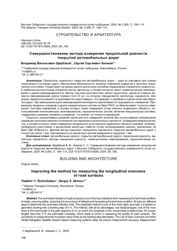 Статья: СОВЕРШЕНСТВОВАНИЕ МЕТОДА ИЗМЕРЕНИЯ ПРОДОЛЬНОЙ РОВНОСТИ ПОКРЫТИЙ АВТОМОБИЛЬНЫХ ДОРОГ