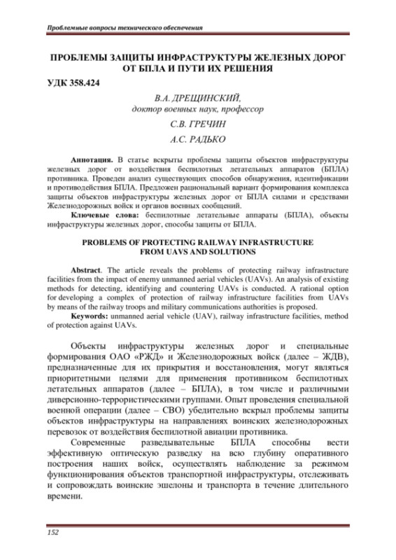 Статья: ПРОБЛЕМЫ ЗАЩИТЫ ИНФРАСТРУКТУРЫ ЖЕЛЕЗНЫХ ДОРОГ ОТ БПЛА И ПУТИ ИХ РЕШЕНИЯ