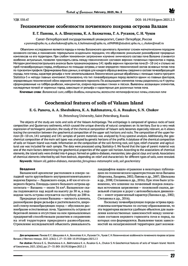 Статья: ГЕОХИМИЧЕСКИЕ ОСОБЕННОСТИ ПОЧВЕННОГО ПОКРОВА ОСТРОВА ВАЛААМ