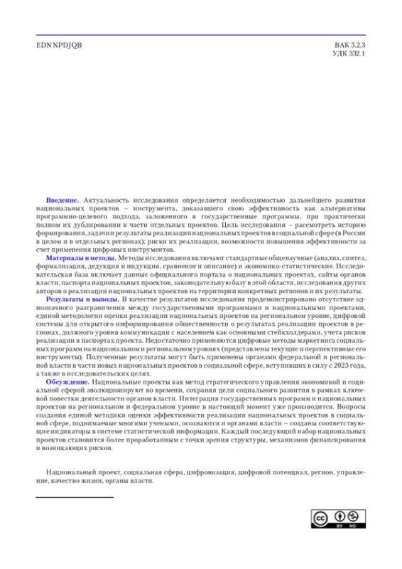 Статья: НАЦИОНАЛЬНЫЕ ПРОЕКТЫ В СОЦИАЛЬНОЙ СФЕРЕ: ЭФФЕКТИВНОСТЬ РЕАЛИЗАЦИИ, РЕГИОНАЛЬНЫЕ РИСКИ, ПРИМЕНЕНИЕ ЦИФРОВЫХ ТЕХНОЛОГИЙ