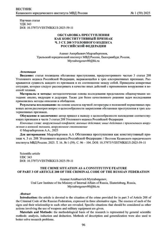 Статья: ОБСТАНОВКА ПРЕСТУПЛЕНИЯ КАК КОНСТИТУТИВНЫЙ ПРИЗНАК Ч. 3 СТ. 208 УГОЛОВНОГО КОДЕКСА РОССИЙСКОЙ ФЕДЕРАЦИИ