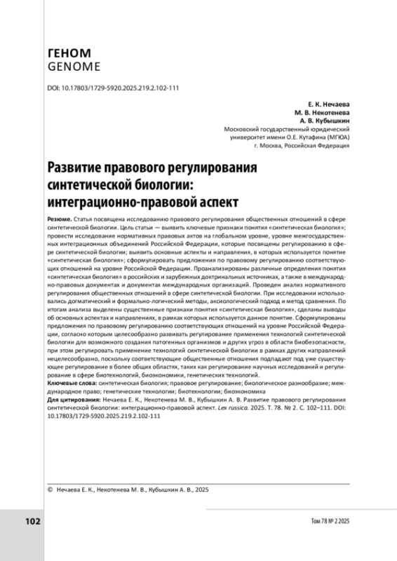 Статья: Развитие правового регулирования синтетической биологии: интеграционно-правовой аспект