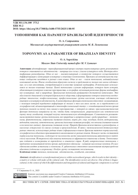 Статья: ТОПОНИМИЯ КАК ПАРАМЕТР БРАЗИЛЬСКОЙ ИДЕНТИЧНОСТИ