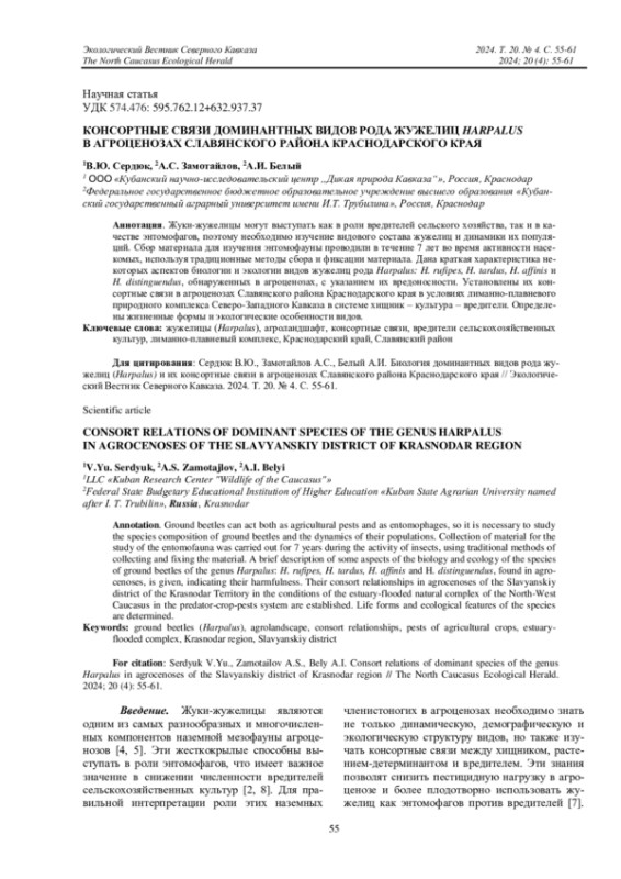 Статья: Консортные связи доминантных видов рода жужелиц Harpalus в агроценозах Славянского района Краснодарского края