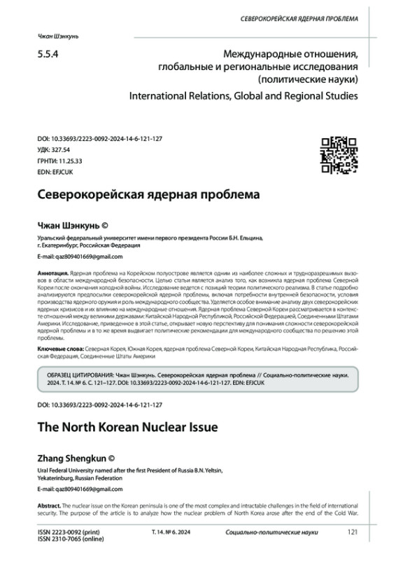Ядерная проблема на Корейском полуострове является одним из наиболее сложных и трудноразрешимых вызовов в области международной безопасности. Целью статьи является анализ того, как возникла ядерная проблема Северной Кореи после окончания холодной войны. Исследование ведется с позиций теории политического реализма. В статье подробно анализируются предпосылки северокорейской ядерной проблемы, включая потребности внутренней безопасности, условия производства ядерного оружия и роль международного сообщества. Уделяется особое внимание анализу двух северокорейских ядерных кризисов и их влиянию на международные отношения. Ядерная проблема Северной Кореи рассматривается в контексте отношений между великими державами: Китайской Народной Республикой, Российской Федерацией, Соединенными Штатами Америки. Исследование, приведенное в этой статье, открывает новую перспективу для понимания сложности северокорейской ядерной проблемы и в то же время выдвигает политические рекомендации для международного сообщества по решению этой проблемы.