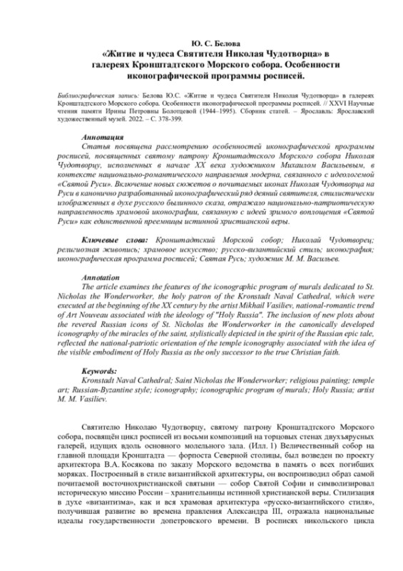Белова Ю.С. «Житие и чудеса Святителя Николая Чудотворца» в галереях Кронштадтского Морского собора. Особенности иконографической программы росписей. // XXVI Научные чтения памяти Ирины Петровны Болотцевой (1944–1995). Сборник статей. – Ярославль: Ярославский художественный музей. 2022. – С. 378-399.