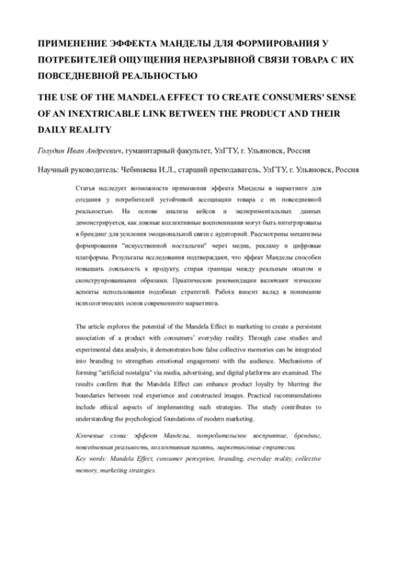 Голудин, И. А. Применение эффекта Манделы для формирования у потребителей ощущения неразрывной связи товара с их повседневной реальностью / И. А. Голудин, И. Л. Чебиняева // Инновационные подходы в современной науке : Сборник статей по материалам CXCIII международной научно-практической конференции, Москва, 04 июля 2025 года. – Москва: Общество с ограниченной ответственностью “Интернаука”, 2025. – С. 64-69. – EDN YAVUXQ.