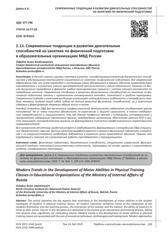 Статья: СОВРЕМЕННЫЕ ТЕНДЕНЦИИ В РАЗВИТИИ ДВИГАТЕЛЬНЫХ СПОСОБНОСТЕЙ НА ЗАНЯТИЯХ ПО ФИЗИЧЕСКОЙ ПОДГОТОВКЕ В ОБРАЗОВАТЕЛЬНЫХ ОРГАНИЗАЦИЯХ МВД РОССИИ