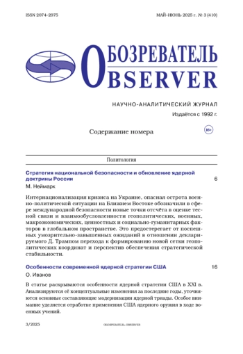 Интернационализация кризиса на Украине, опасная острота военно-политической ситуации на Ближнем Востоке обозначили в сфере международной безопасности новые точки отсчёта в оценке тесной связи и взаимообусловленности геополитических, военных, макроэкономических, ценностных и социально-гуманитарных факторов в глобальном пространстве. Это предостерегает от поспешных умозрительно-завышенных ожиданий в отношении декларируемого Д. Трампом перехода к формированию новой сетки геополитических координат и перспектив обеспечения стратегической стабильности.