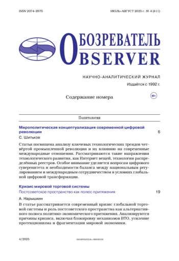 Статья посвящена анализу ключевых технологических трендов чет вёртой промышленной революции и их влиянию на современные международные отношения. Рассматриваются такие направления технологического развития, как Интернет вещей, технологии распре делённых реестров. Особое внимание уделяется вопросам цифрового суверенитета и необходимости баланса между национальным регу лированием и международным сотрудничеством в условиях глобаль ной цифровой трансформации.