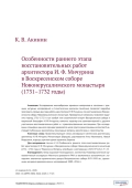 Исследование многообразных архивных материалов в сочетании с данными натурных исследований и стилистическим анализом памятника позволяет подробно проследить первые два года работы архитектора И. Ф. Мичурина по восстановлению Воскресенского собора Новоиерусалимского монастыря. Приведенные материалы позволяют выделить период 1731–1732 гг. как особый этап строительной истории Воскресенского собора и творческой биографии И. Ф. Мичурина, наметить характер его взаимоотношений с другими участниками восстановительных работ и с правительственными инстанциями. При исследовании специфики данного периода проявляется целая группа разноплановых аспектов. В настоящей публикации рассмотрены прикладные вопросы архитектуры и строительства.